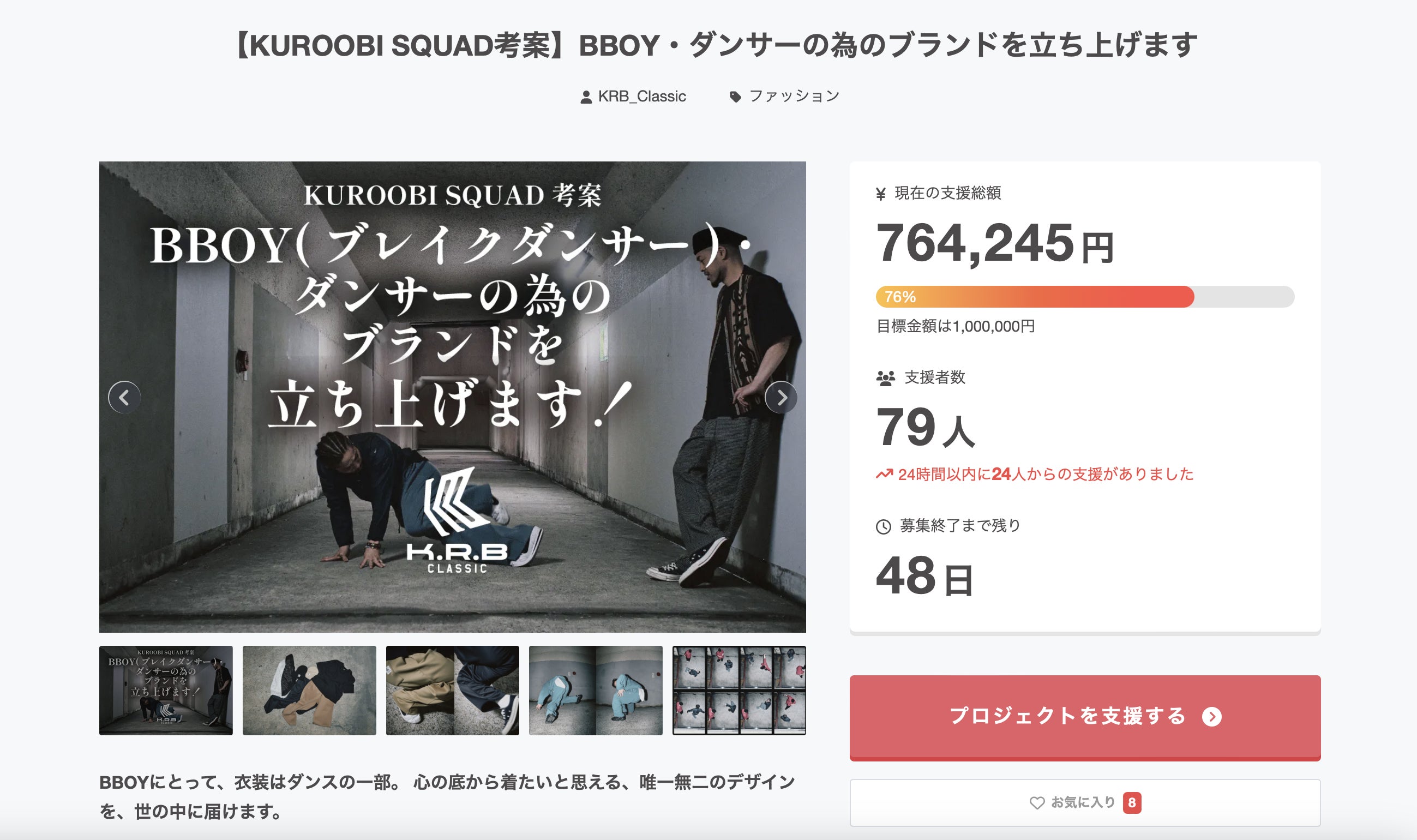 皆様、多くのご支援、SNSでの告知、また温かい応援メッセージなど頂き、本当にありがとうございます!皆様のおかげで、公開3日目で目標額の7割、764,245円まで達成することが出来ました!今回のプロジェクトを通して皆様が黒帯をどれだけ応援して頂けていたかと言うことが、身に沁みるほど理解出来ました。本当に皆様に生かされているなと、痛感しています。感謝しかありません。何度も言わせて頂きます、ありがとうございます!皆様から大きなパワーをもらって、ここから目標達成へ向けて、更に邁進してまいります!ご支援して頂いた方、もし直接会えた場合は、大人の方でしたら、是非一緒に乾杯させてください!!飲めない方は直接お礼を言わせてください!未成年の方もジュースで乾杯しましょう!道半ば、しっかり目標を達成し、皆様が応援した甲斐があったなと思って頂けるよう、精進してまいりますので、今しばらく私達のプロジェクトにご協力ください!最後になりますが、ご支援に改めて心より感謝致します。KUROOBI SQUAD SEIJI