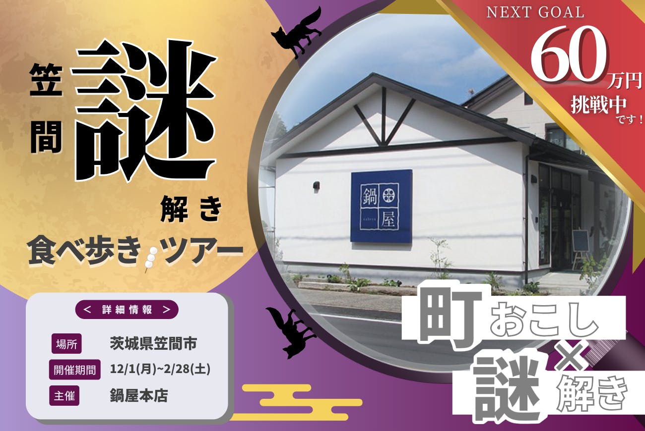 2025/11/25 13:34皆さまのあたたかいご支援のおかげで、クラウドファンディングの初回目標30万円を達成することができました!心より感謝申し上げます。笠間で370年以上商いを続けてきた鍋屋が挑む、まちを歩き、味わい、出会う『笠間 謎解き食べ歩きツアー』。皆さまの応援が、この体験の第一歩を支えてくださいました。ですが私たちは、ここで終わろうとは思っていません。このツアーを、第二弾、第三弾へと続けていく構想を描いています。そこで次なる目標として、ネクストゴール60万円に挑戦します。▼資金の使い道(予定)・季節ごとの特別仕様キット(春編・夏編など)の試作・観光案内や地図付きガイドブックの制作・イベント運営体制の強化、サポート体制の整備・今後の開催継続に向けた改善・検討活動 など謎解きの詳細は、当日のお楽しみにしていただきたいのでここでは明かしませんが、「また来たい」「誰かに教えたい」と思っていただけるような、記憶に残る体験をお届けします。笠間の魅力を“続けて届ける”挑戦に、どうか引き続きのご支援・応援をお願いいたします! もっと見る