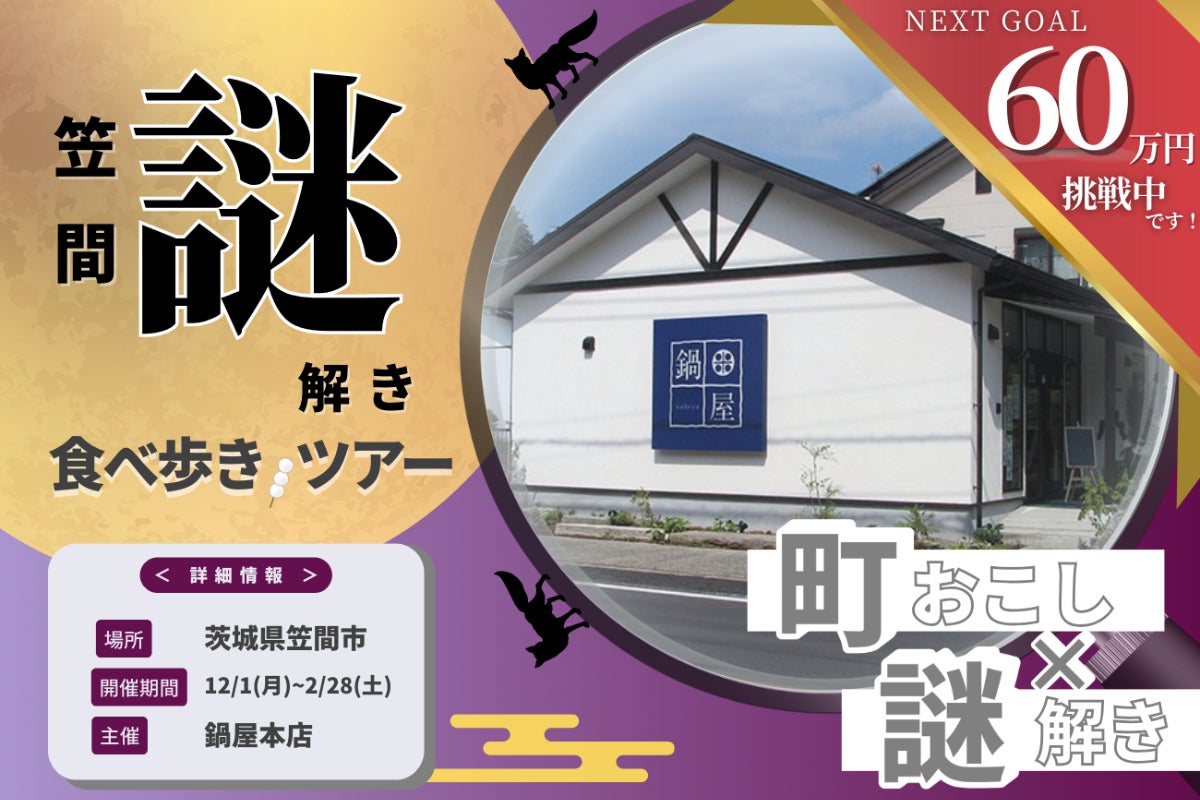 2025/11/25 13:34皆さまのあたたかいご支援のおかげで、クラウドファンディングの初回目標30万円を達成することができました!心より感謝申し上げます。笠間で370年以上商いを続けてきた鍋屋が挑む、まちを歩き、味わい、出会う『笠間 謎解き食べ歩きツアー』。皆さまの応援が、この体験の第一歩を支えてくださいました。ですが私たちは、ここで終わろうとは思っていません。このツアーを、第二弾、第三弾へと続けていく構想を描いています。そこで次なる目標として、ネクストゴール60万円に挑戦します。▼資金の使い道(予定)・季節ごとの特別仕様キット(春編・夏編など)の試作・観光案内や地図付きガイドブックの制作・イベント運営体制の強化、サポート体制の整備・今後の開催継続に向けた改善・検討活動 など謎解きの詳細は、当日のお楽しみにしていただきたいのでここでは明かしませんが、「また来たい」「誰かに教えたい」と思っていただけるような、記憶に残る体験をお届けします。笠間の魅力を“続けて届ける”挑戦に、どうか引き続きのご支援・応援をお願いいたします! もっと見る