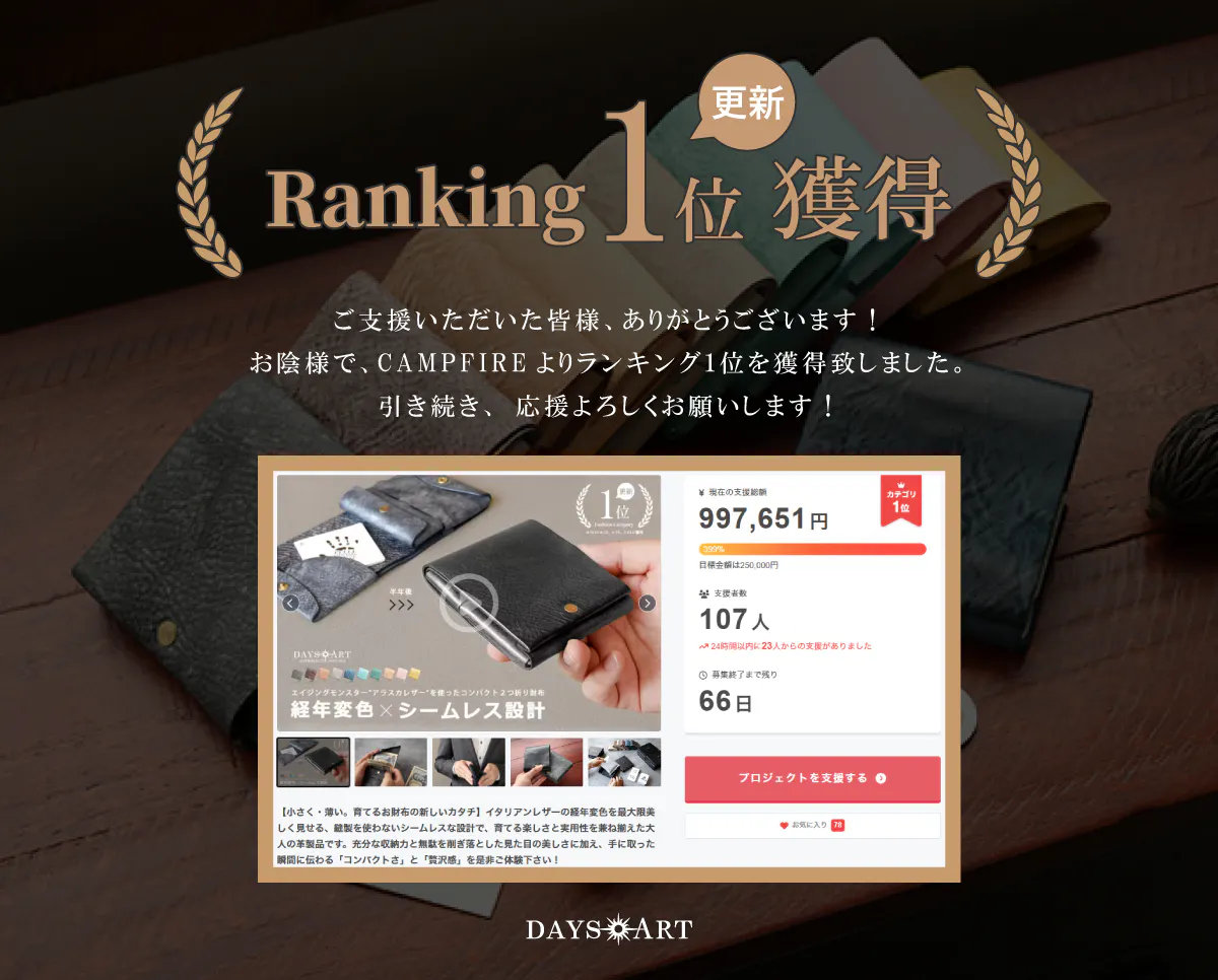 2025/10/02 10:08こんにちは、DAYSARTです。この度は、当プロジェクトにご支援頂きまして本当にありがとうございます。目標を達成することができました事改めて御礼申し上げます。本プロジェクトのリターン発送が、全てのご支援者に完了致しました事お知らせ致します。またこの度、ご好評頂きました当プロジェクトは、定番化が決定しDAYSART公式サイトにて一般販売を開始することとなりました。一般販売価格:12,000円(送料・製込み)https://daysart-official.com/products/lw259・迷っていたらプロジェクトが終了してしまった・違うタイプも欲しい・友人やパートナーへプレゼントしたいなど、お問い合わせも多く頂いており活動報告を通してご連絡とさせて頂きます。今後ともDAYSARTをよろしくお願い致します。 もっと見る