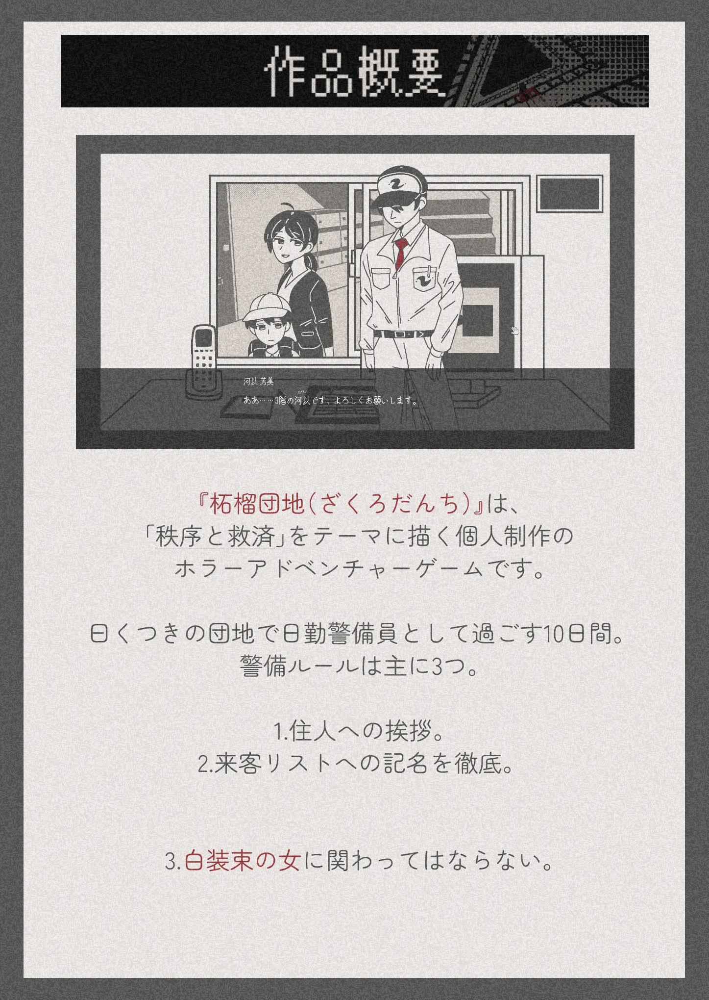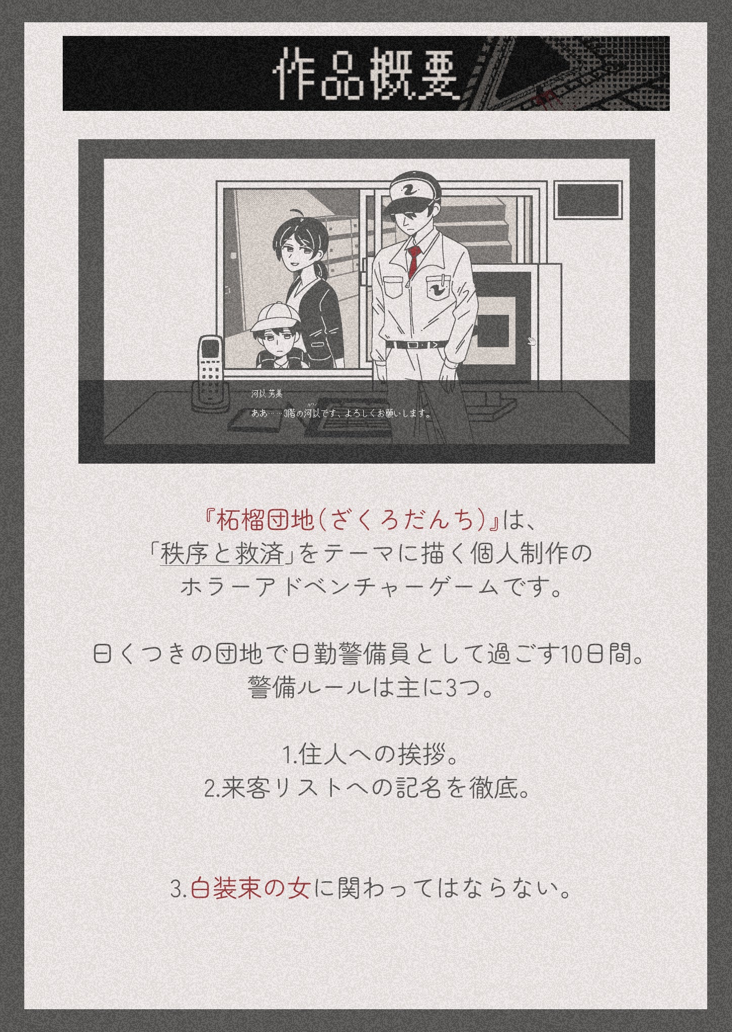 プレイヤーは“日勤警備員”として赴任し、巡回・監視・住民対応を行いながら、謎のルールと異常現象に巻き込まれていきます。