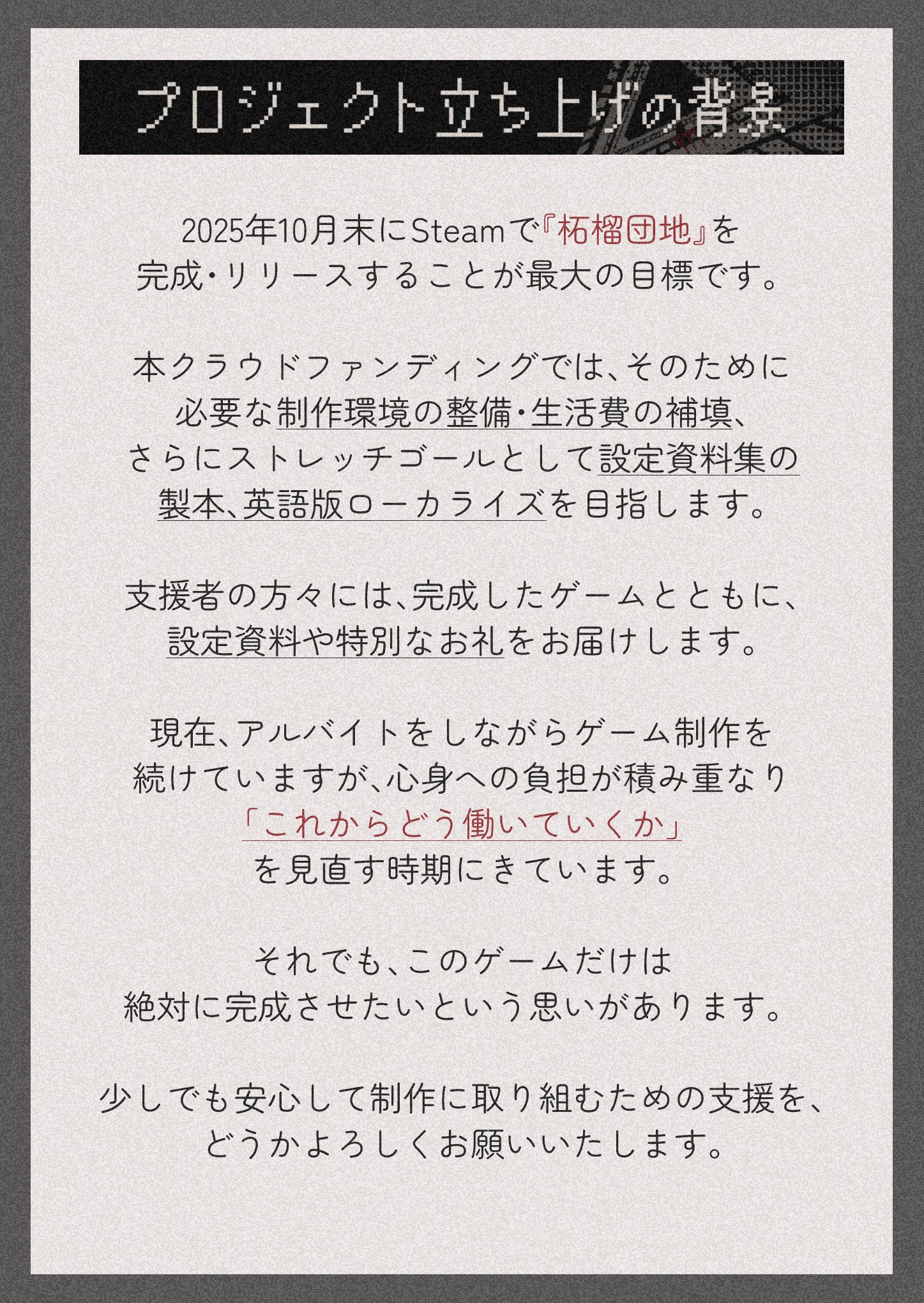 2025/12/02 10:01こちらの活動報告は支援者限定の公開です。【進捗報告】『柘榴団地』開発月報【2025年11月1日】