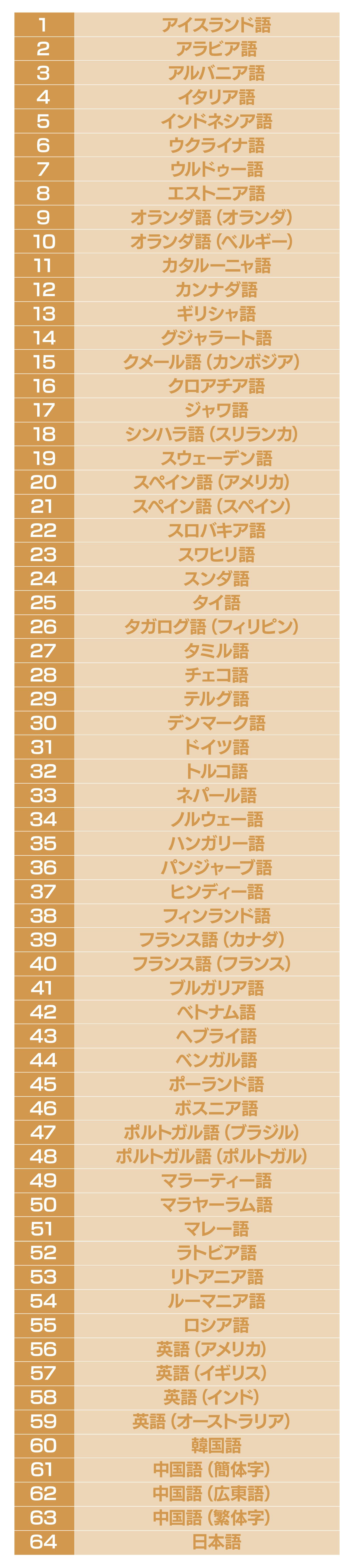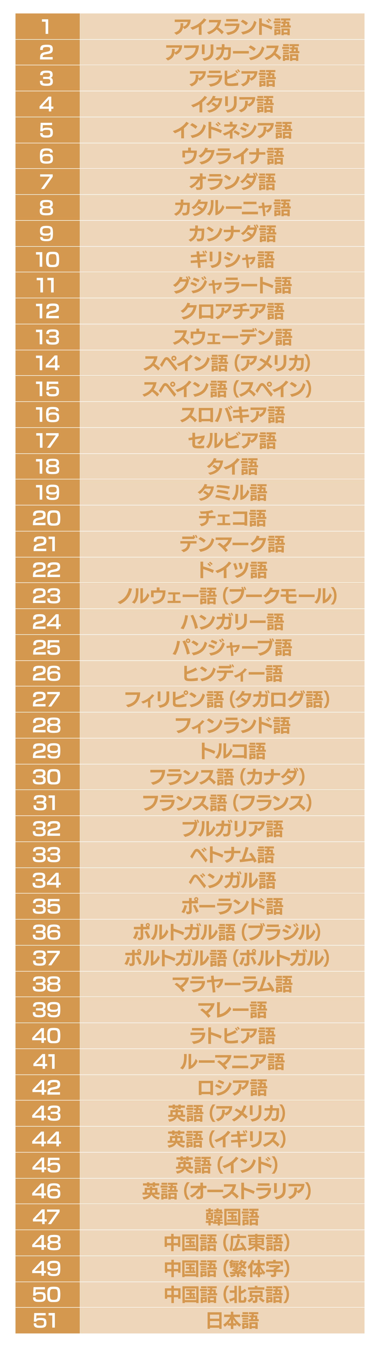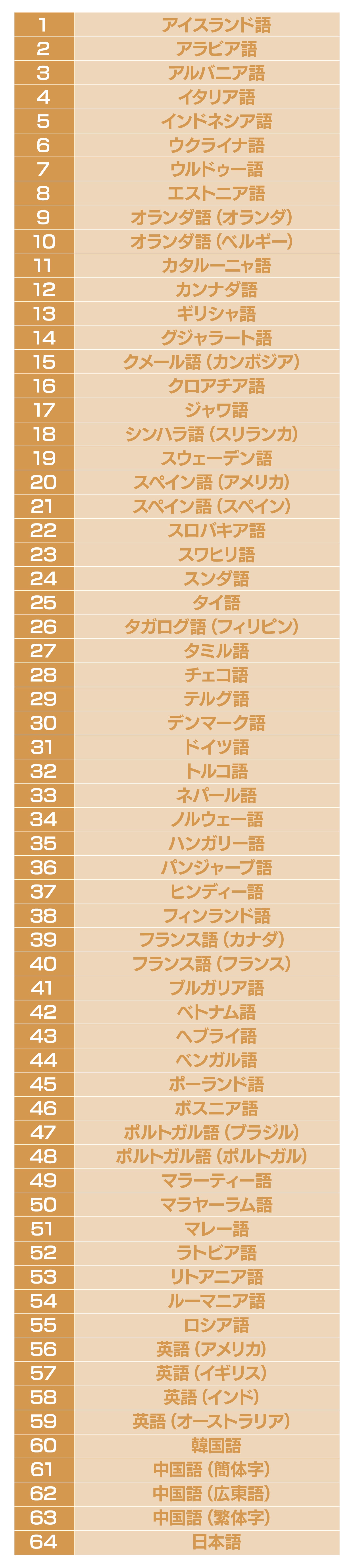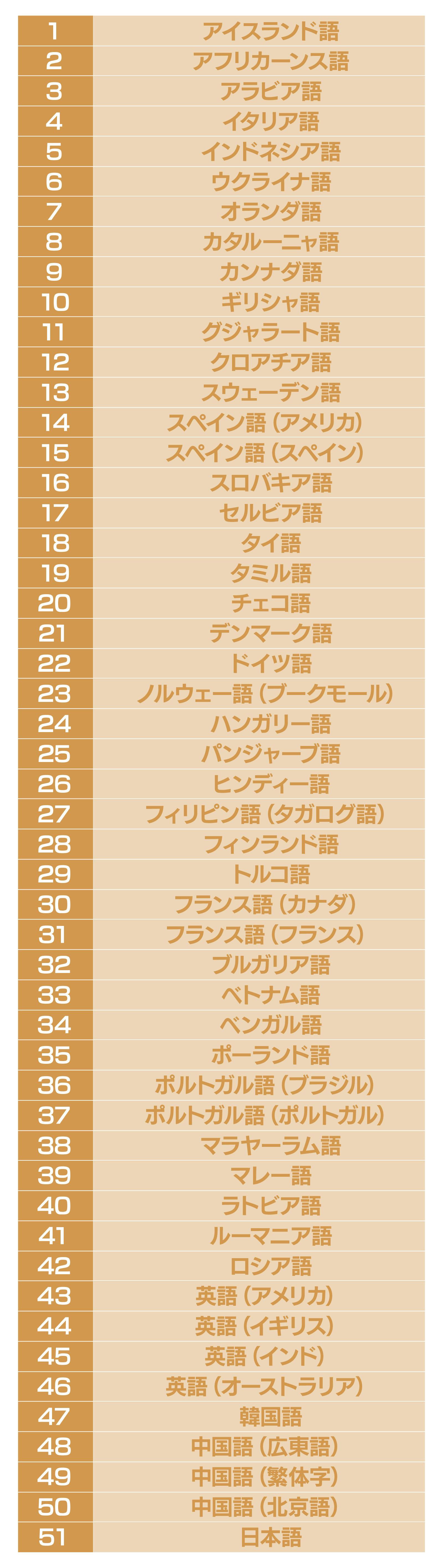 日本語や英語はもちろん、フランス語、アラビア語、中国語、ロシア語…さらには韓国語、ベトナム語、タイ語などアジア圏、デンマーク語やノルウェー語などマイナー言語まで幅広く対応。