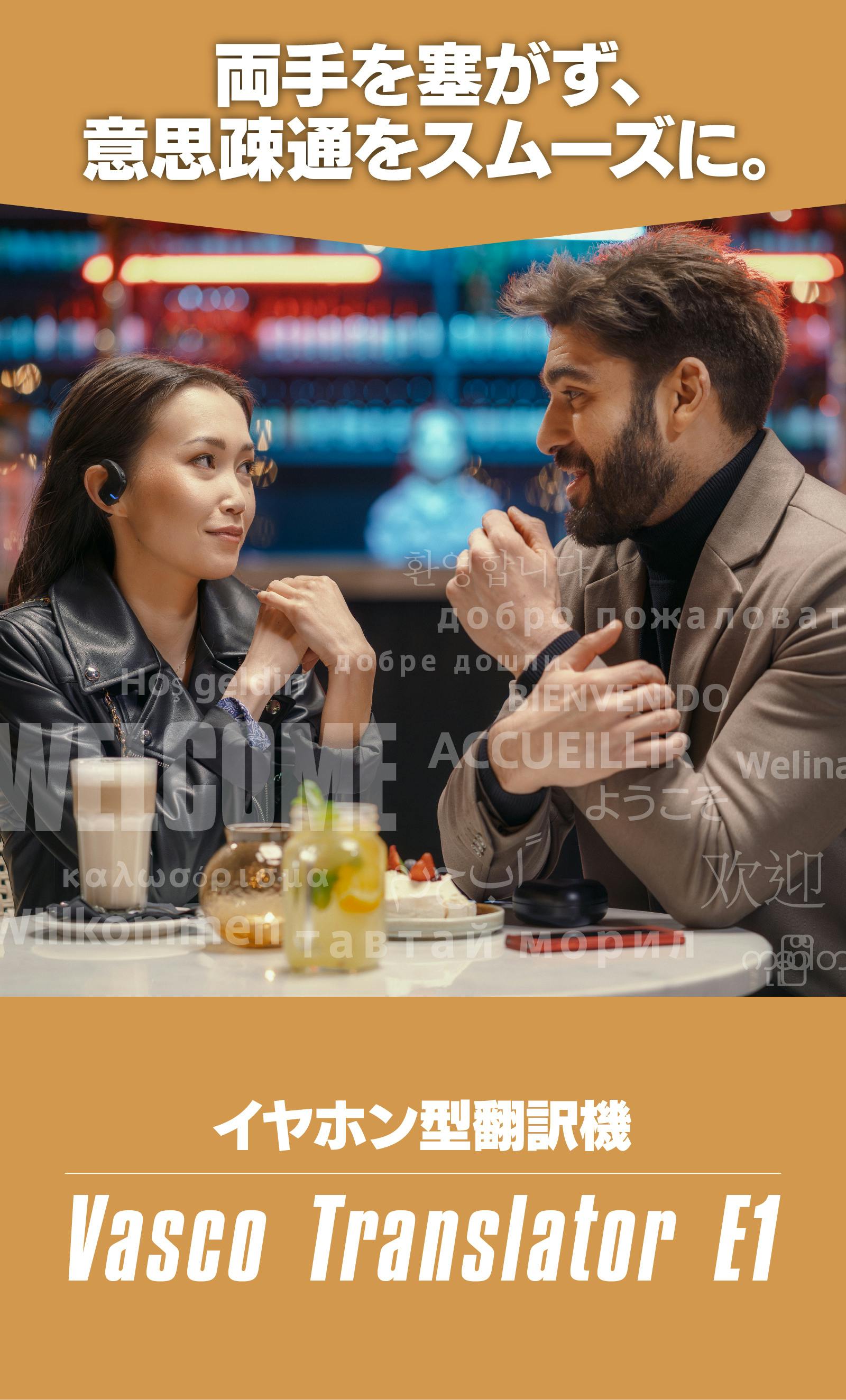 これまでにご好評いただいた「Vasco Translator M3」「V4」に続き、 今回は“もっと自然に、もっと自由に”会話ができる次世代の翻訳機として、 「Vasco Translator E1」 を新たに開発しました。 耳元でそっと翻訳してくれるE1は、従来のように翻訳機を手に持つ必要がなく、 よりスムーズで自然な会話を実現します。 特に、ビジネスシーンにおいて、「正確さ」と「スムーズさ」が同時に求められる場面に最適です。