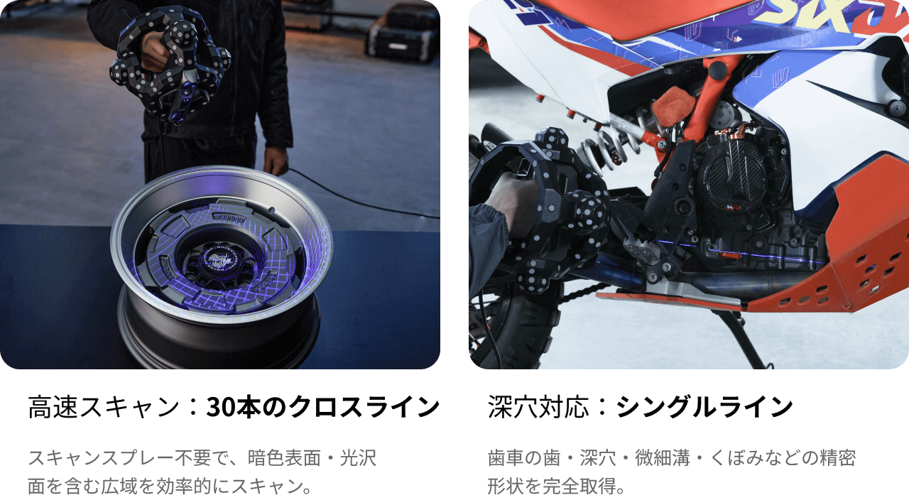 マーカー不要の産業用スキャニング向けに設計された、先進の光学トラッキング式及びブルーレーザー3Dスキャンシステム。体積精度を保証し、累積誤差を大幅に低減することで、硬貨から自動車に至るまで、あらゆるサイズの対象物を高効率でスキャン。従来の工程を高度に簡素化し、作業プロセスの革新を実現します。