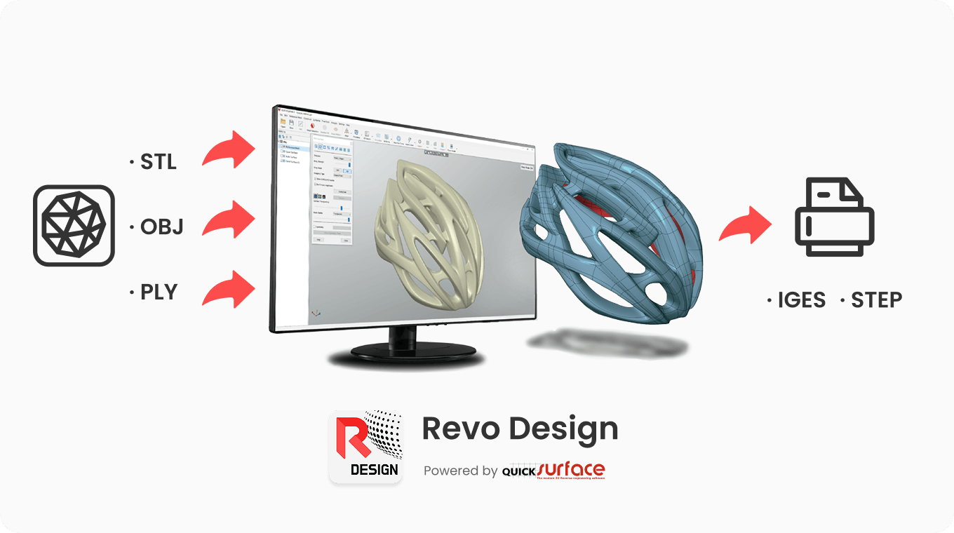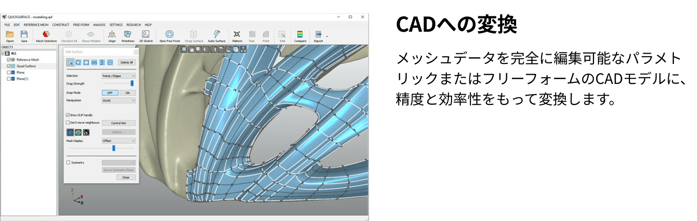 Revo Design(QUICKSURFACE Liteと同一機能)は、3Dスキャンとエンジニアリング設計の間のギャップを埋め、3DスキャンデータのCADへの変換を合理化します。メッシュ編集、フリーフォーム/パラメトリックモデリング、スキャンto CADワークフロー用の堅牢なツールを備えており、リバースエンジニアリング、製品開発、工業デザインに最適です。