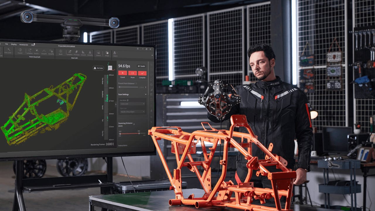 Trackitのデュアルカメラベースステーションが、10mm~6mのワークピース向け3Dレーザースキャン生産性を革新。スキャナーの空間動作をリアルタイム追跡し、マーカー不要・後処理不要で高精度3Dモデルを直接生成します。