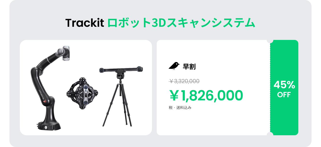 「Revo ロボット自動スキャンシステム」は現時点では他ブランドのロボットをサポートしておりません。本ソフトウェアは「Trackit ロボット3Dスキャンシステムセット」に同梱されるロボットアーム専用です。お客様がご自身のロボットアームをお持ちの場合、TCP/IPベースのソフトウェア制御プロトコルを提供いたします。これにより、当社が提供するソフトウェア「Revo Trackit」を使用して、スキャナをご自身のロボットに統合することが可能です。