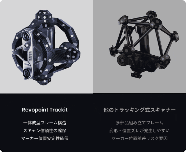 Trackitの耐久性抜群の一体型カーボンファイバーフレームにより、フレーム変形によるマーカー位置ずれが発生せず、毎回一貫したスキャンデータを保証。過酷な環境下での使用に耐える頑丈かつ軽量設計で、長時間のスキャン作業でも疲れにくい構造です。