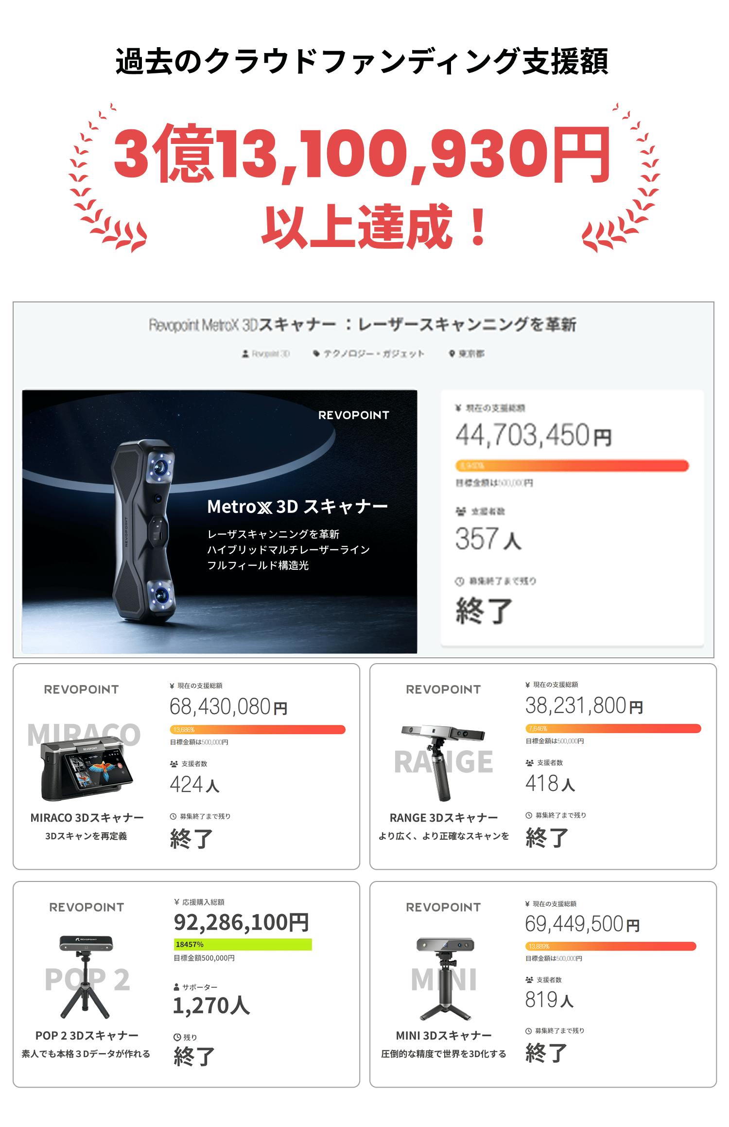 Revopointは、2014年の設立以来、「3Dスキャナーをより身近に、より手頃に」をモットーに、デザイナー、クリエイター、エンジニア、自動車愛好家など、あらゆる人々が時間とコストを節約しながら3Dモデルを作成できるよう、製品開発に取り組んできました。これまでに複数のクラウドファンディングプロジェクトを展開し、10以上の主要製品を開発・発売し、2万9千人以上の方々にご支援いただきました。世界的に有名な研究機関出身の博士号取得者から成る専門チームが、3Dスキャン業界のイノベーションを牽引しています。優れた性能、携帯性、使いやすさを兼ね備えたRevopointの3Dスキャナーは、世界150以上の国と地域で販売され、業界をリードする存在となっています。