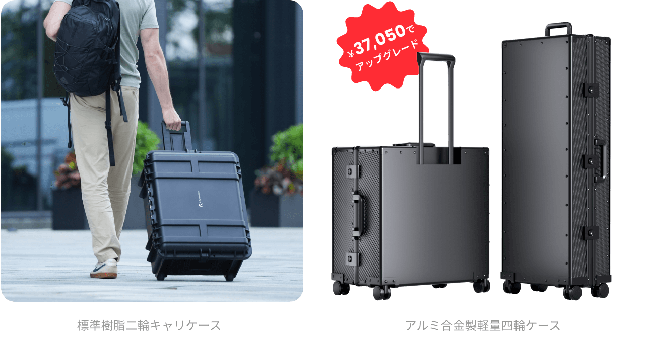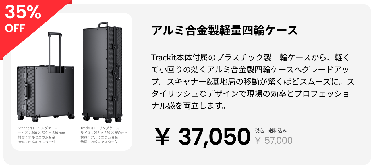 車輪付き保護ケース付きで、どこへでもTrackitを簡単に持ち運び。現場での便利で安全な輸送とセットアップを保証。アップグレードオプション:耐久性と移動性をさらに向上させたアルミニウム合金製四輪キャリーケースに、わずか¥37,050でアップグレード可能。