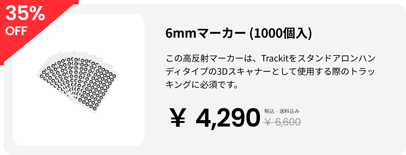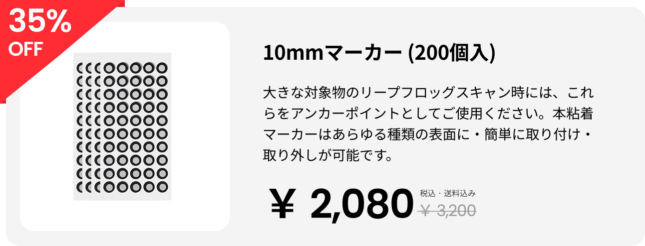トラッキングスキャンモードではインテリジェント光学トラッキングを搭載しているため、対象物にマーカーを貼る必要はありません。ただしマルチポジションスキャンおよびマーカースキャンでは、少量のマーカーを補助的に使用する必要があります。