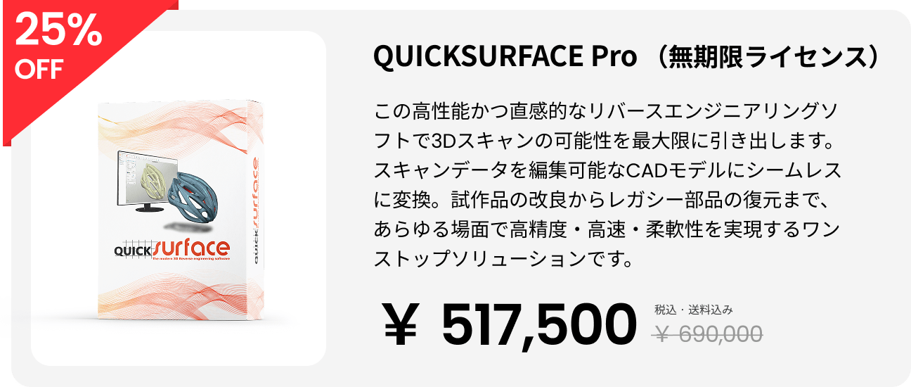● 主な用途:自動車改造設計、機械製造、リバースエンジニアリング、プロトタイピング、パーツ製造など、スキャンからCADへの変換や測定・加工データの活用を重視する方におすすめの構成です。