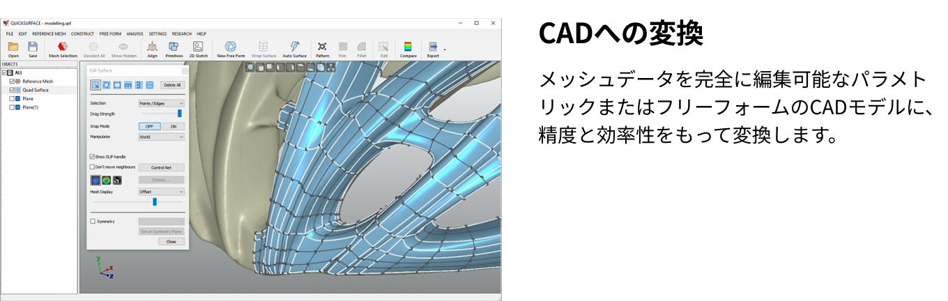 Revo Design(QUICKSURFACE Liteと同一機能)は、3Dスキャンとエンジニアリング設計の間のギャップを埋め、3DスキャンデータのCADへの変換を合理化します。メッシュ編集、フリーフォーム/パラメトリックモデリング、スキャンto CADワークフロー用の堅牢なツールを備えており、リバースエンジニアリング、製品開発、工業デザインに最適です。