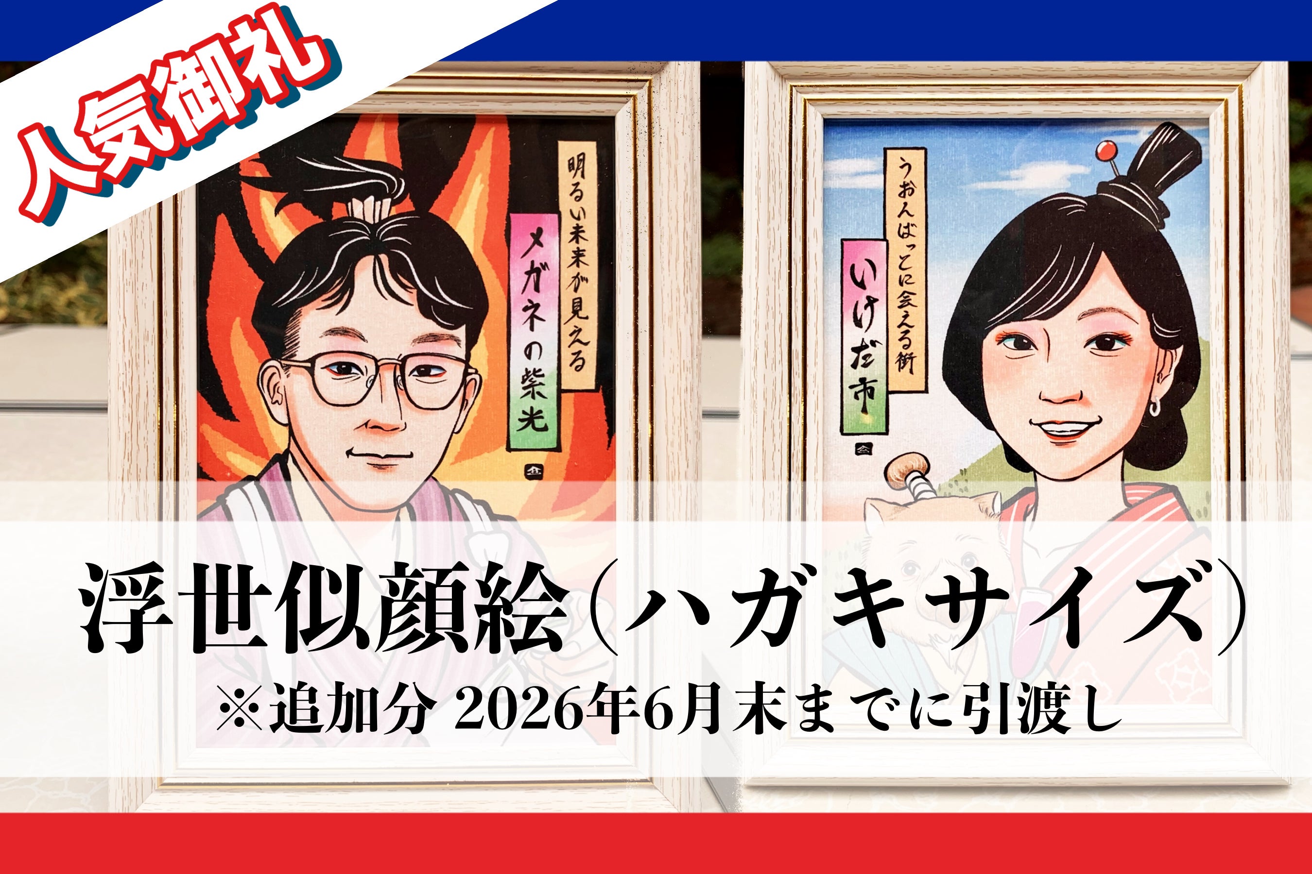 ※このリターンは、既存のリターン「浮世似顔絵(ハガキサイズ)10,000円」と比べて、作品の納品時期が3ヶ月遅い2026年6月末まで、になっております。