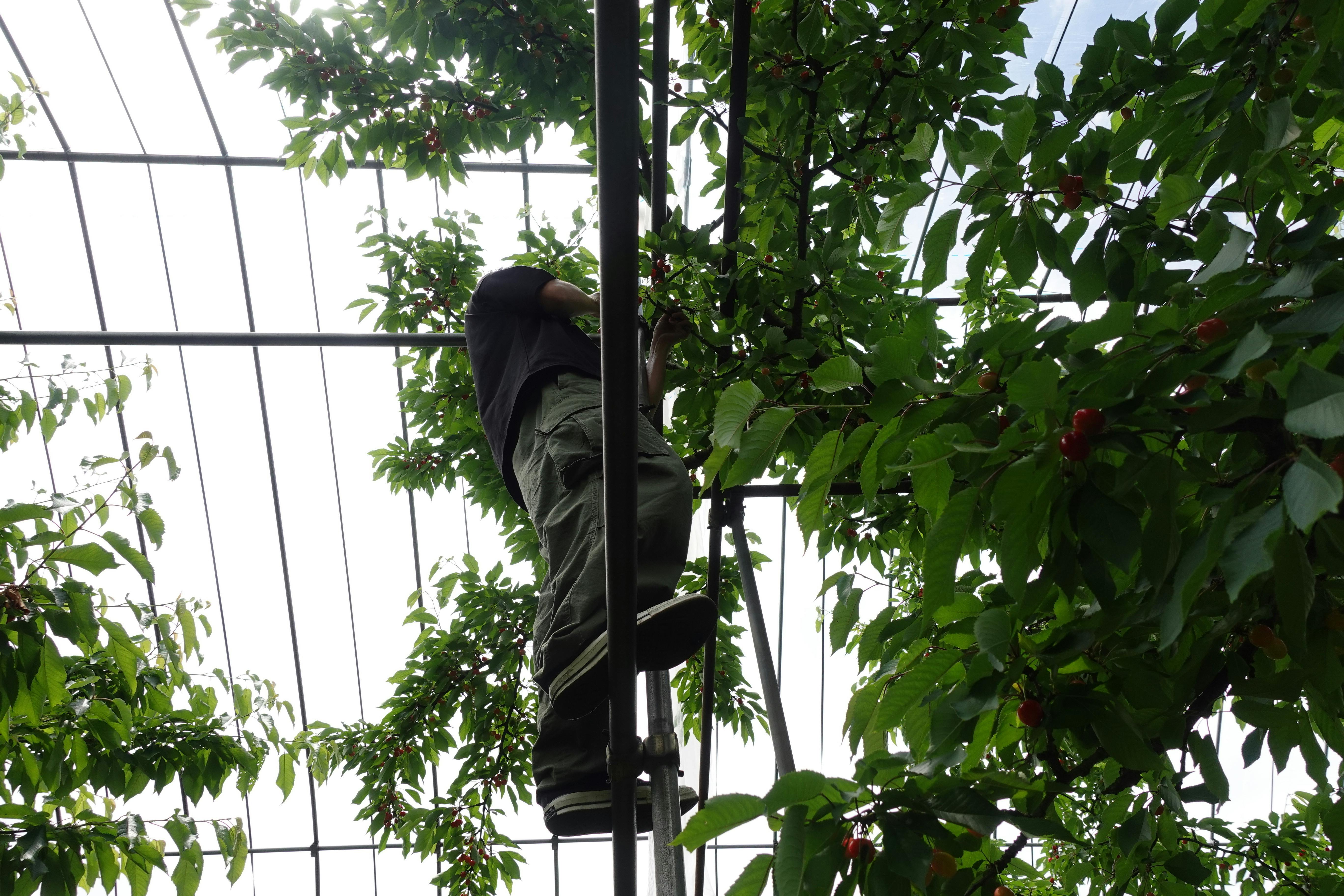 そして、皆さまのご支援が後押しとなり、老朽化して危険だった農園の鉄パイプを新しくできる見通しが立ったとのこと。この鉄パイプは、さくらんぼの枝を支えたり、ネットやビニールハウスを張るための大切な骨組み。写真のように高所での作業の足場としても欠かせない設備です。