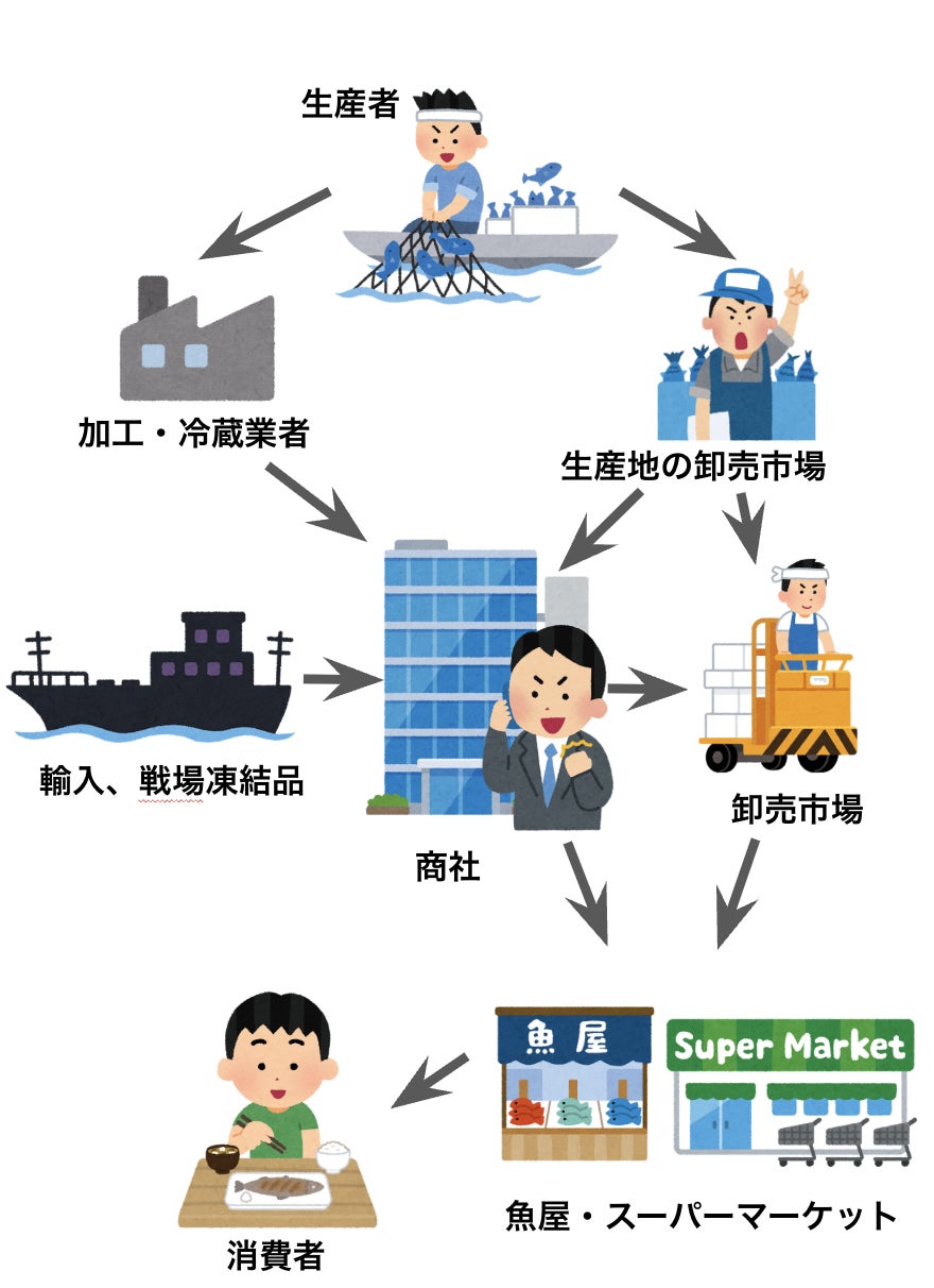 通常、魚がご家庭に届くまでには複数の仲介が入り、およそ3~4日かかることが一般的ですが、