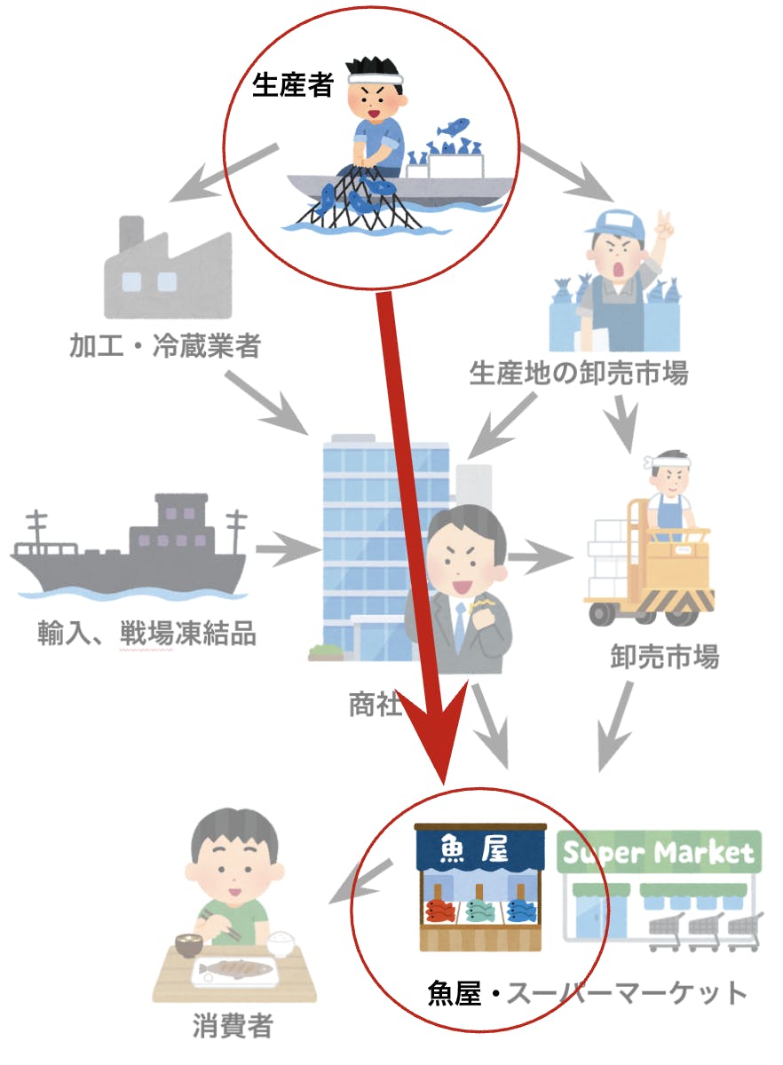 通常、魚がご家庭に届くまでには複数の仲介が入り、およそ3~4日かかることが一般的ですが、