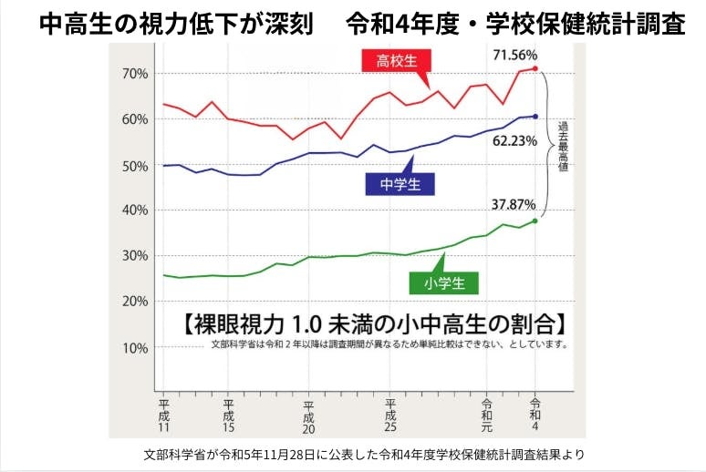 ・裸眼視力が1.0未満の子どもが右肩上がり