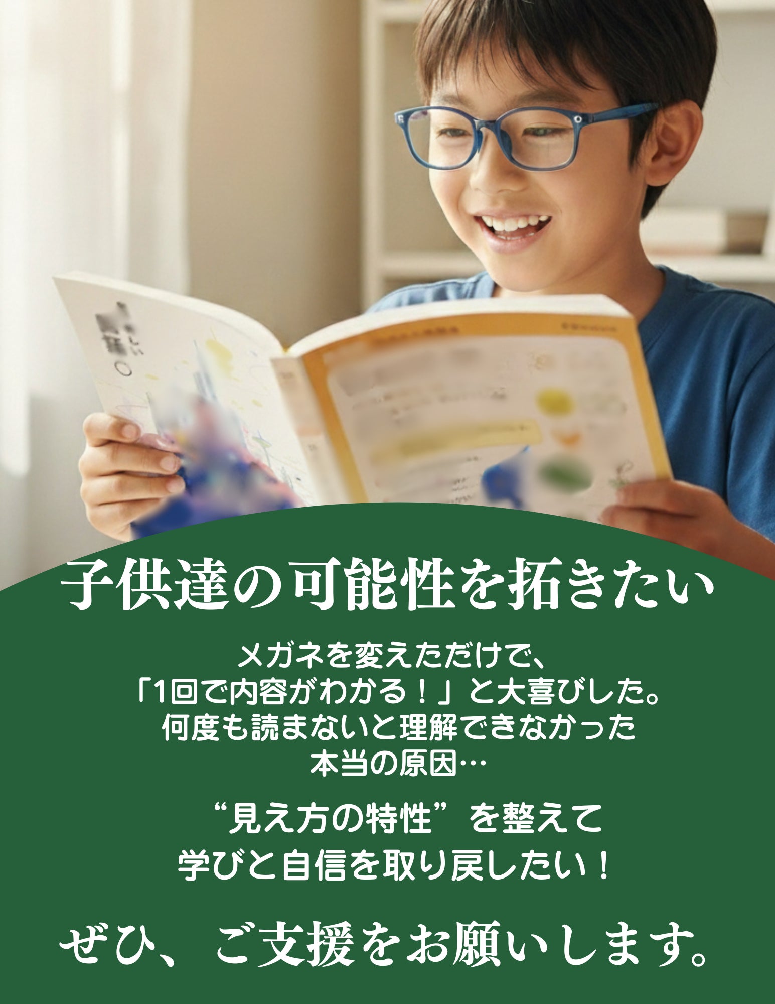 このプロジェクトのリターンを通じて、一人でも多くの方が“自分や家族、そして社会を担う子供達の目”に向き合うきっかけになることを願っています。