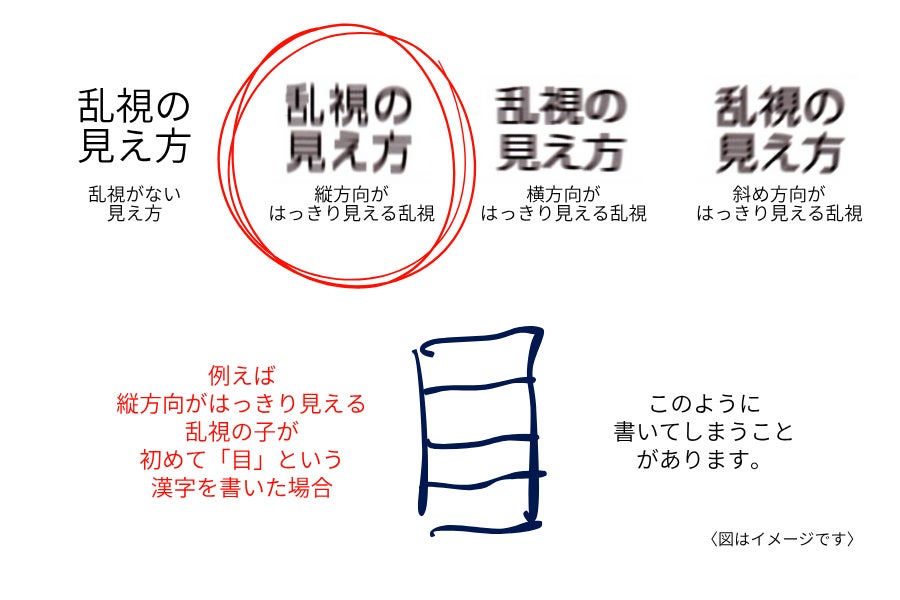 また、きちんと見ているにもかかわらず、漢字学習などの書き取りが、罫線からはみ出ていたり、ちゃんと書き取りができなかったり、図形の問題が苦手いという場合は乱視が疑われることもあります。