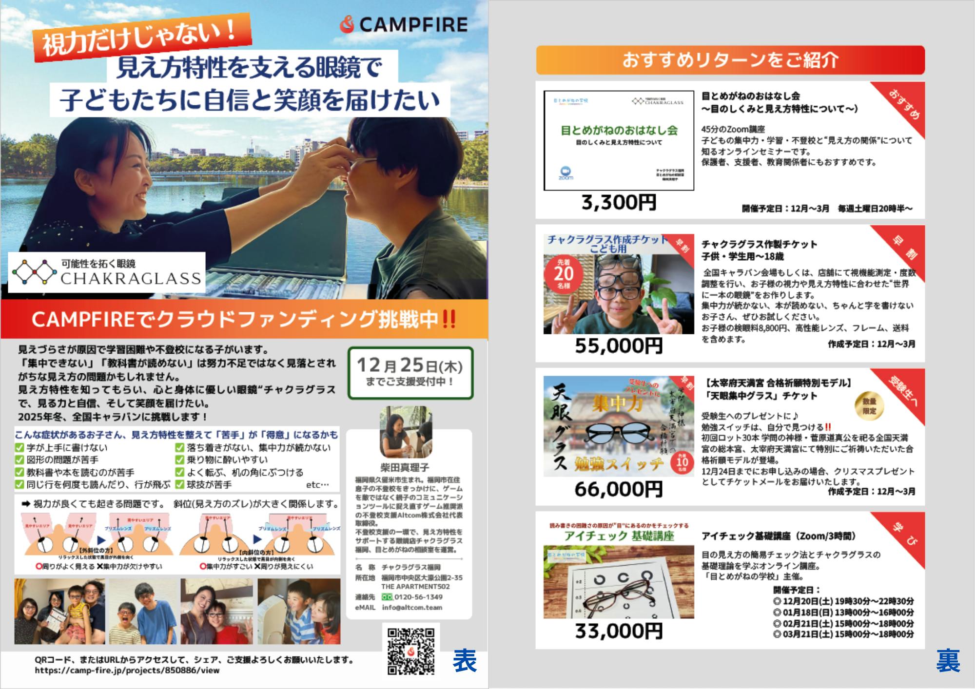 2025/12/12 07:30クラファン応援してくださる皆さま、ありがとうございます。本日は、今回のクラファンのチラシ をご紹介します。今回のチラシは“お伝えしたいことを真正面から届ける” 熱いトーン で仕上げました。実際にチラシをご覧いただくと分かる通り、「視力だけじゃない!」「見え方特性を支える眼鏡で、子どもたちに自信と笑顔を届けたい」見え方のズレ(斜位)が学習・集中・不登校に影響することを、大きな文字と図解でしっかり伝えています。ちょっと熱すぎたかな…笑また、ページ下には子どもたちの笑顔の写真も掲載し“見え方が変わると、子どもの未来がこんなに輝く”というリアルを感じられる構成になっています。さらに、右側には「不登校支援」と「見え方特性」のつながりを記載しています。今回のクラファンは見逃されている、子どもたちの可能性を取り返す挑戦です。チラシが、その想いをしっかり後押ししてくれる仕上がりになりました。全国キャラバンで、多くの子に必要な光が届きますように。保護者の皆様、学校の先生方、お子様に関われている方々いらっしゃいましたら、シェアよろしくお願いいたします。 もっと見る