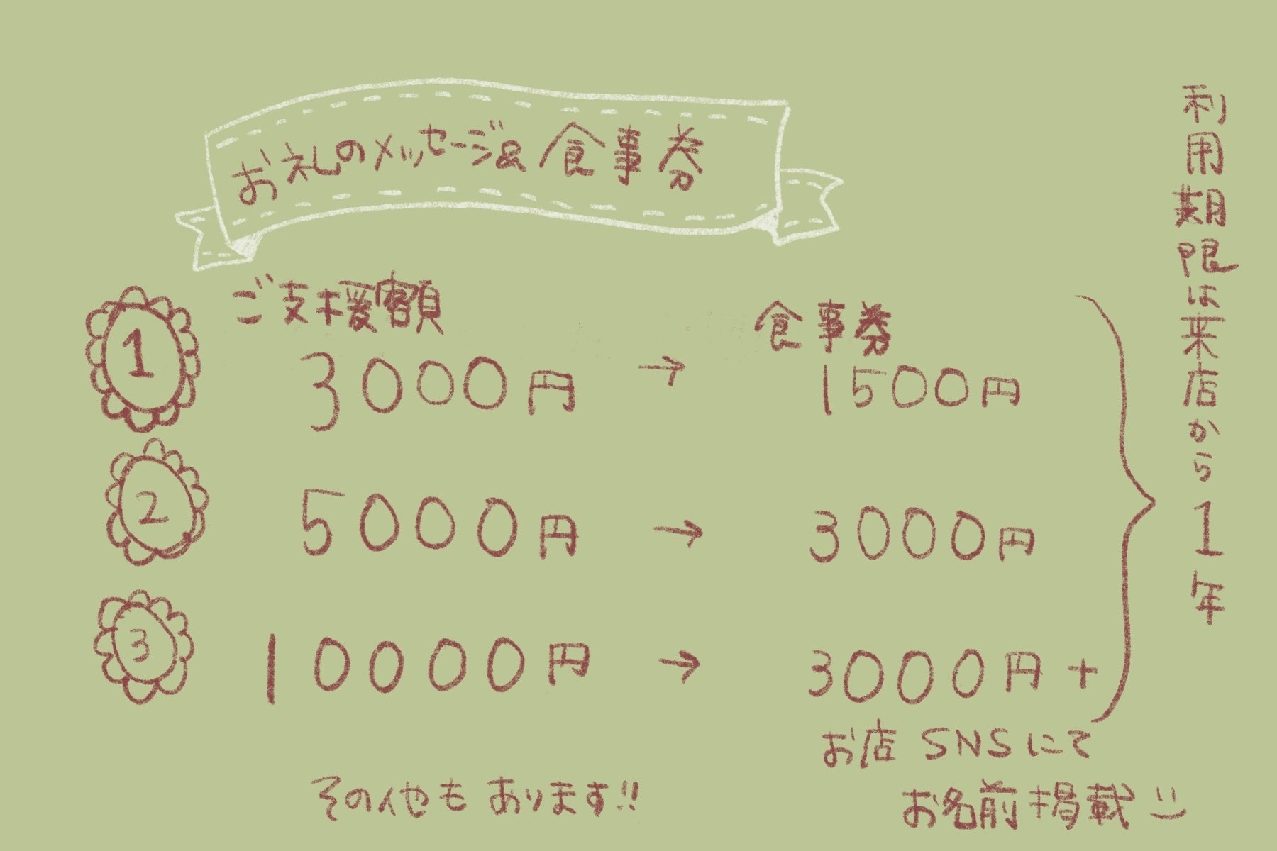 当店で使えるドリンク券とお礼のメッセージを郵送させていただきます。