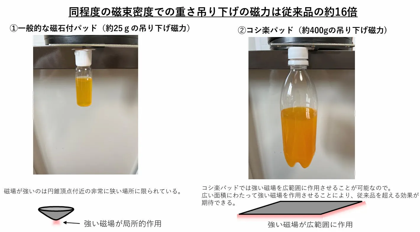 従来の固形粒上の磁石付バンソウコウやパッドでは、磁石が腰部に接触できる「点」でしか、磁力線の効果が及ばないのですが、コシ楽パッドで採用しているフレキシブルな面状磁石では、「面」での磁力線の効果が広範囲に及ぶため、腰のツボをより効果的にカバーすることが可能になります。以下の写真は、同じ程度の磁束密度を有する従来品とコシ楽パッドの実際の磁力の強さを、吊り下げる力 で比較したものになります。従来品ではフェライト系磁石素材、コシ楽パッドではレアアース系磁石素材を使用していますが、同じ程度の強さの磁束密度でも、「点」と「面」では約16倍もの差があることがわかります。