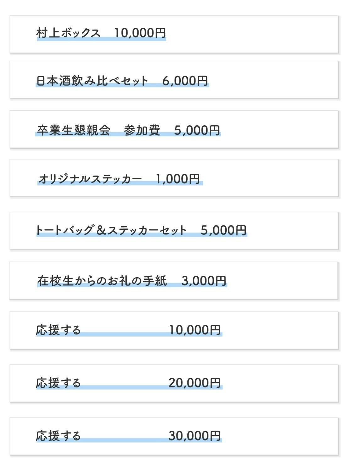 私たちは、支援者の皆様に村上の魅力と母校への愛を感じていただけるリターンをご用意いたします。