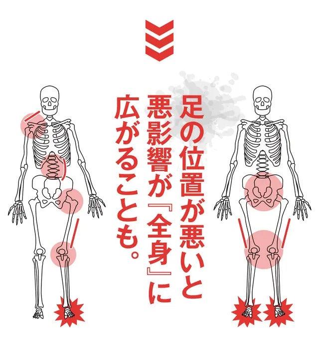 足の位置が正しいとしっかりとした足裏アーチが形成されるので、地面からの衝撃を吸収し足や関節・腰への負担が軽減されます。