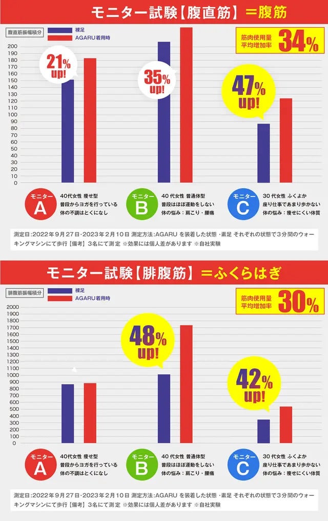 ▲実際にAGARUを未装着の状態・装着した状態でウォーキングし、筋電測定実験を行い比較したところ筋肉使用量がアップしていることがわかりました!
