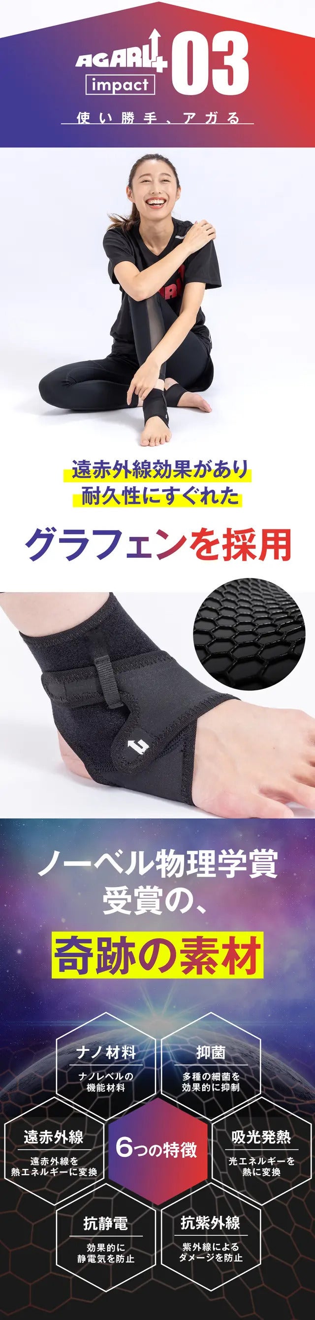サポーターの素材には、奇跡の素材とよばれる「グラフェン」を使用。
