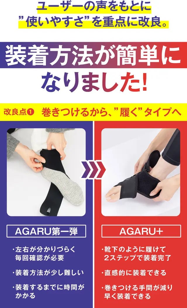 覚えるまでに時間を要する上、毎日装着するには時間がかかり面倒となってしまうというお声もあった装着方法を、今回のAGARU+ではより簡単にすることで、直感的に装着しやすい仕様へと変更しました。