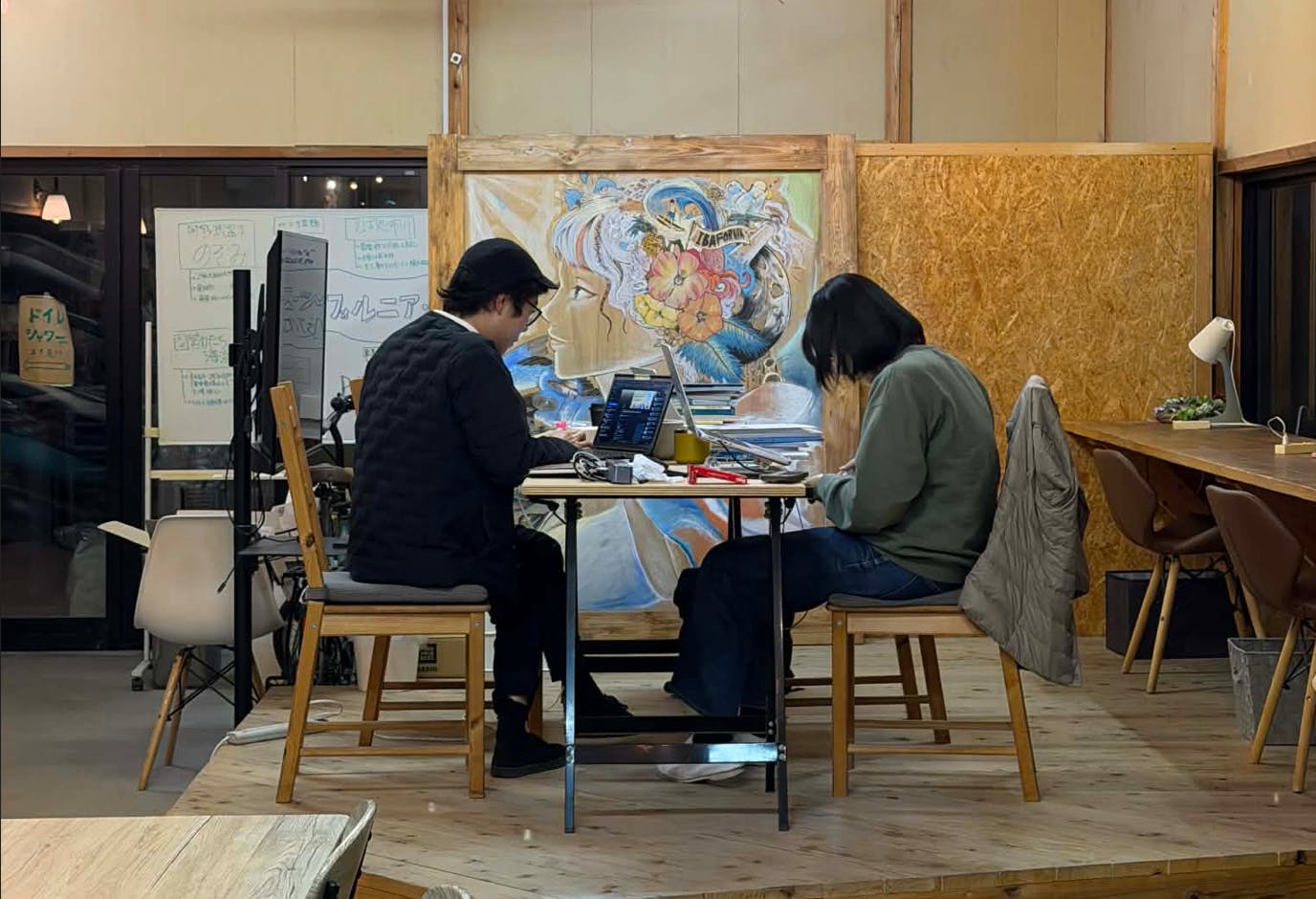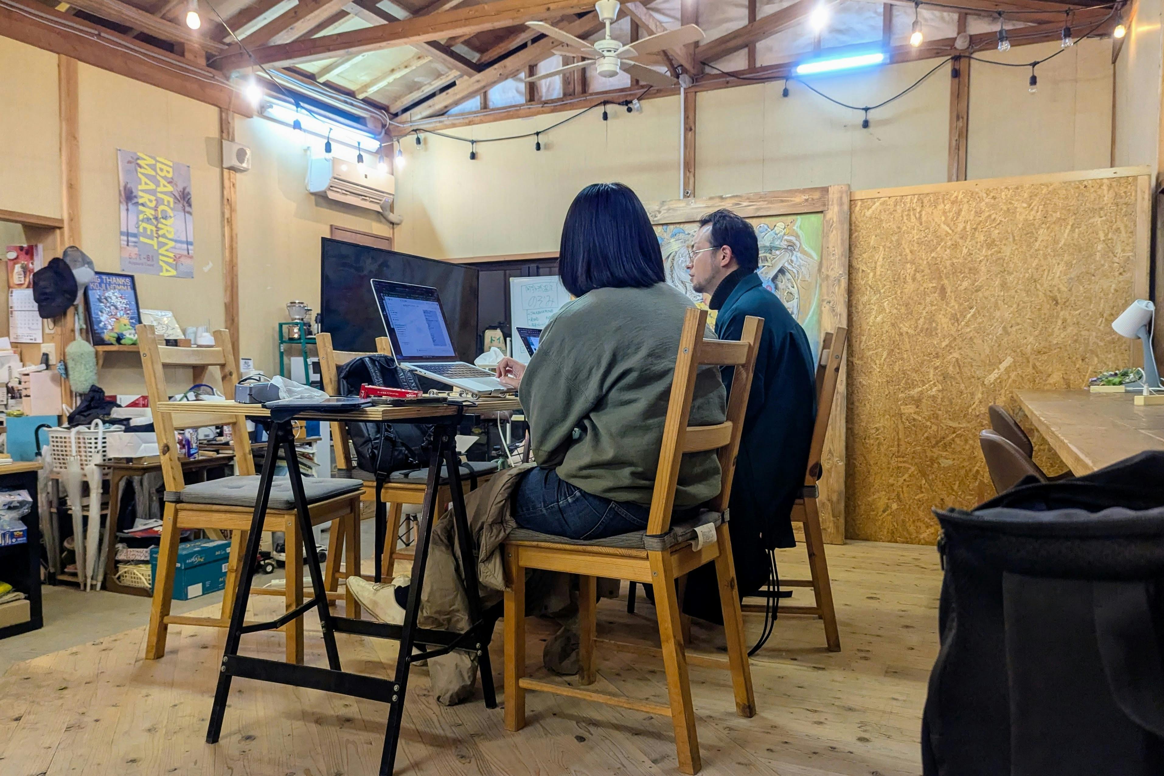 本日は、茨城県ひたちなか市にある「イバフォルニア・ベース」にて作業会。デザイナーの小池隆夫さん・後藤はるかさんとともに、台割(本の設計図みたいなもの)を睨みながらデザイン会議しております。