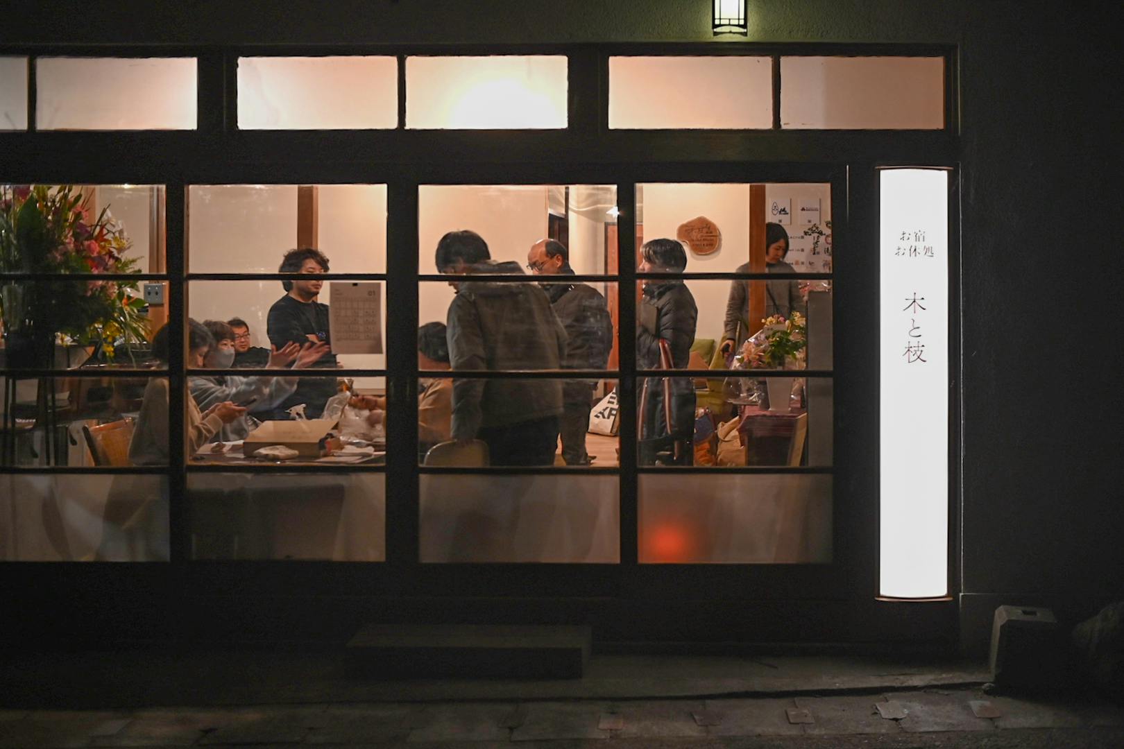 二件目到着。グランドオープンを祝うみなさまでにぎわう、ゲストハウス木と枝。 街歩きの拠点としてもぴったり。土間で行われているのは、栃木県の伝統工芸品「日光下駄」の職人さんによるワークショップ。