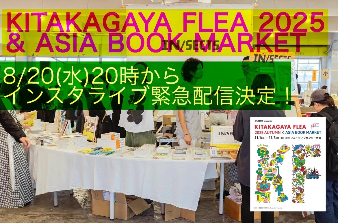 本クラウドファンディングを応援してくださる皆様、本当にありがとうございます。おかげさまで150人以上の方にご支援をいただき、感謝の気持ちでいっぱいです。そんなクラウドファンディングも期間終了まで、残り25日を切りました。改めてイベントや本クラウドファンディングについてお話しさせていただきたく「KITAKAGAYA FLEA & ASIA BOOK MARKET」のインスタライブを今夜8月20日(水)の夜20時から緊急配信します!ライブ&パフォーマンスをはじめ、今年の内容が徐々に公開となっている今、見どころやユニークなリターンの紹介、さらに、ASIA BOOK MARKET海外組やZINE FAIRについて、今年の新企画などもご紹介しようと思います。インセクツ編集部総出でお届けしますので、お時間がある方は是非ドリンク片手に集合でお願いします◎配信アカウント:https://www.instagram.com/kitakagaya_flea/