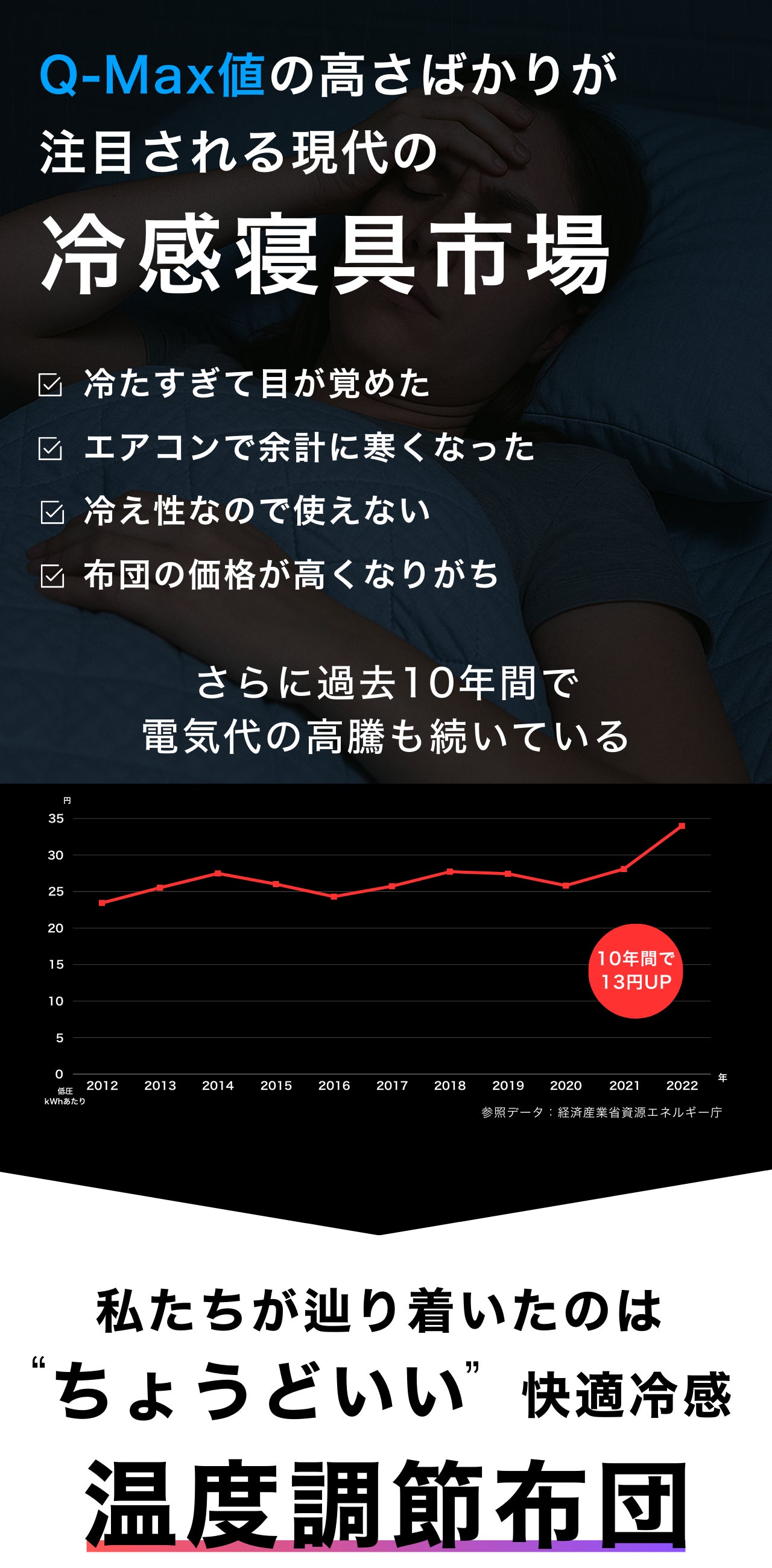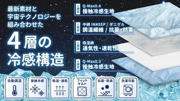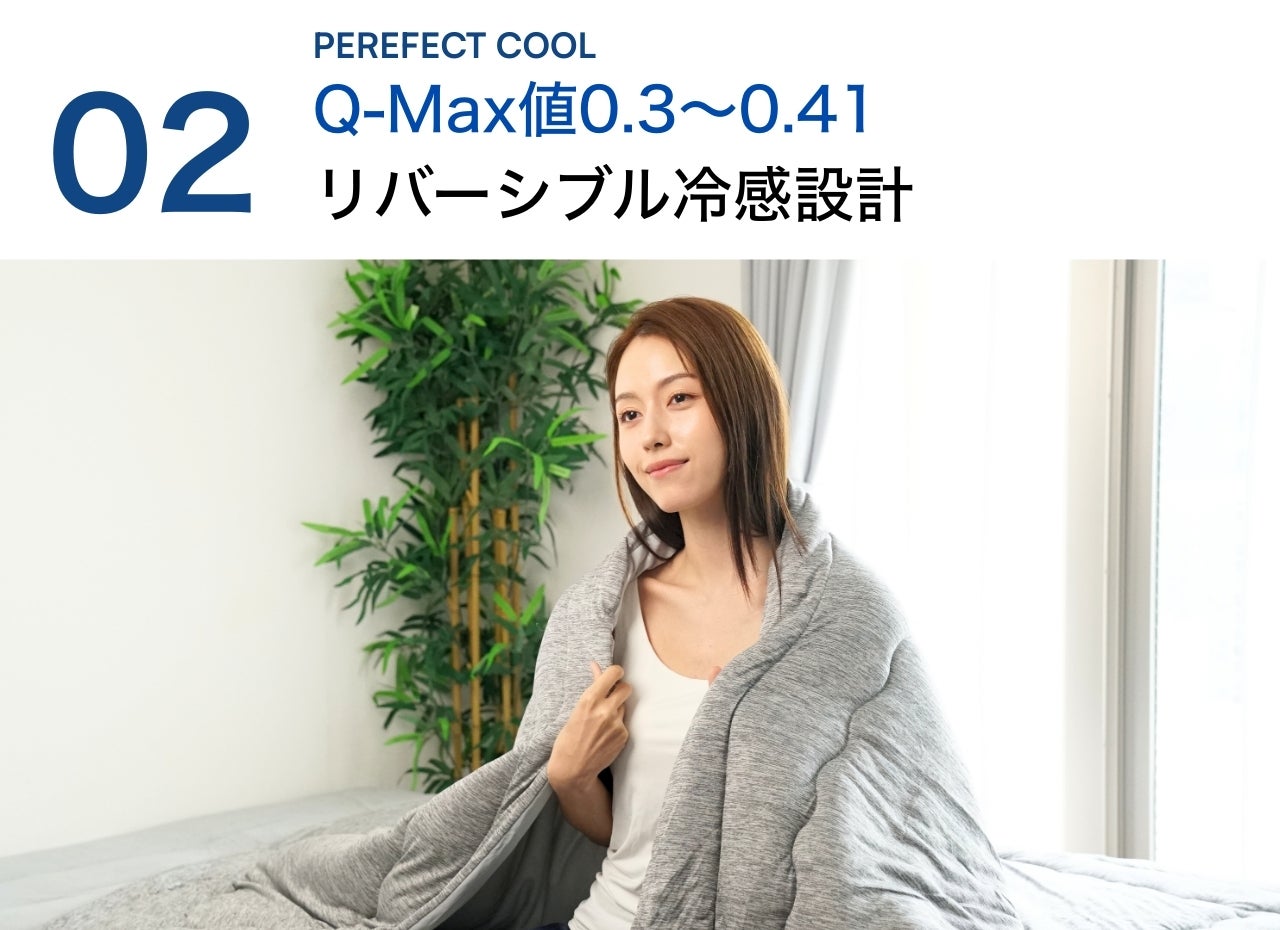 私たちは、冷たさの強さではなく、「眠りやすさ」・「快適さ」を最優先に設計しました。宇宙服にも使われるPCM温度調節素材を中心に、Q-max0.3/0.4のリバーシブル設計を採用し、体温に応じて“ちょうどいい”温度をキープする布団になっております。