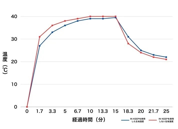 試験結果からINKEEPが温度変化を緩和し、急激に暖かくなったり急激に寒くなったりすることを防ぎ、ちょうどいい温度範囲に保つ効果があることがわかりました。
