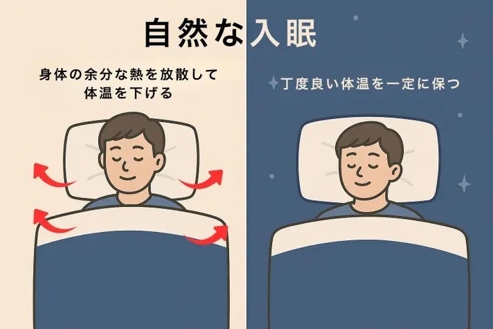 自然な入眠には就寝時に身体の余分な熱をゆるやかに放散して体温を下げ、深い眠りではその体温を安定に保つことが重要だとされています。