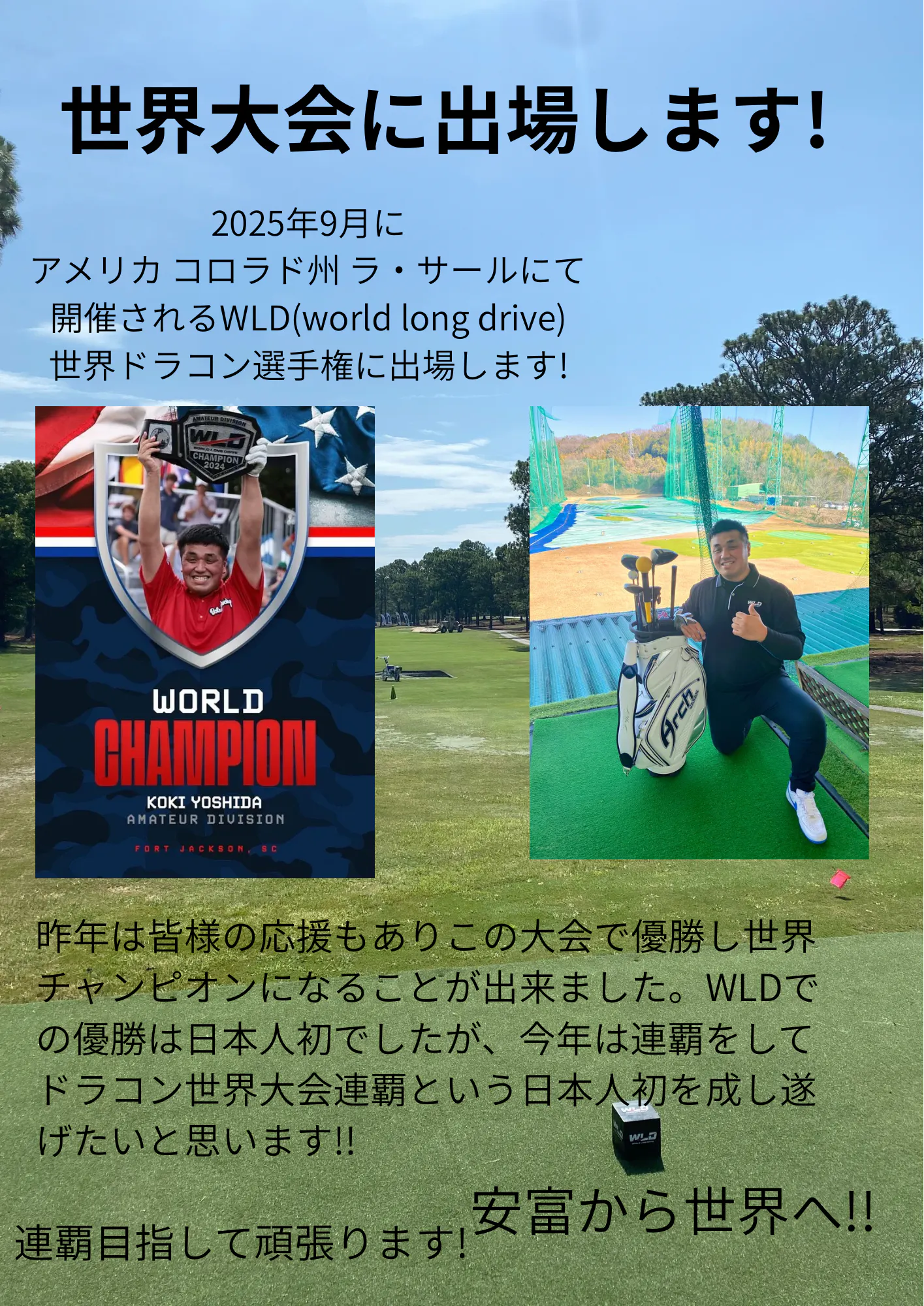 2025/08/01 15:23活動への応援、ご支援本当にありがとうございます!!この度昨年出場し優勝いたしましたWLD 世界ドラコン選手権への出場が決定いたしました!!WLD世界ドラコン選手権でもう一度優勝することを考えて1年間やってきましたので出場できることをまず嬉しく思います!!世界の舞台で戦えること、多くの方々に支えられていることを忘れず全力で頑張ってきます!!様々な方からご支援していただいておりますがまだまだ目標まで遠い道のりです益々のご支援、拡散よろしくお願いいたします!! もっと見る