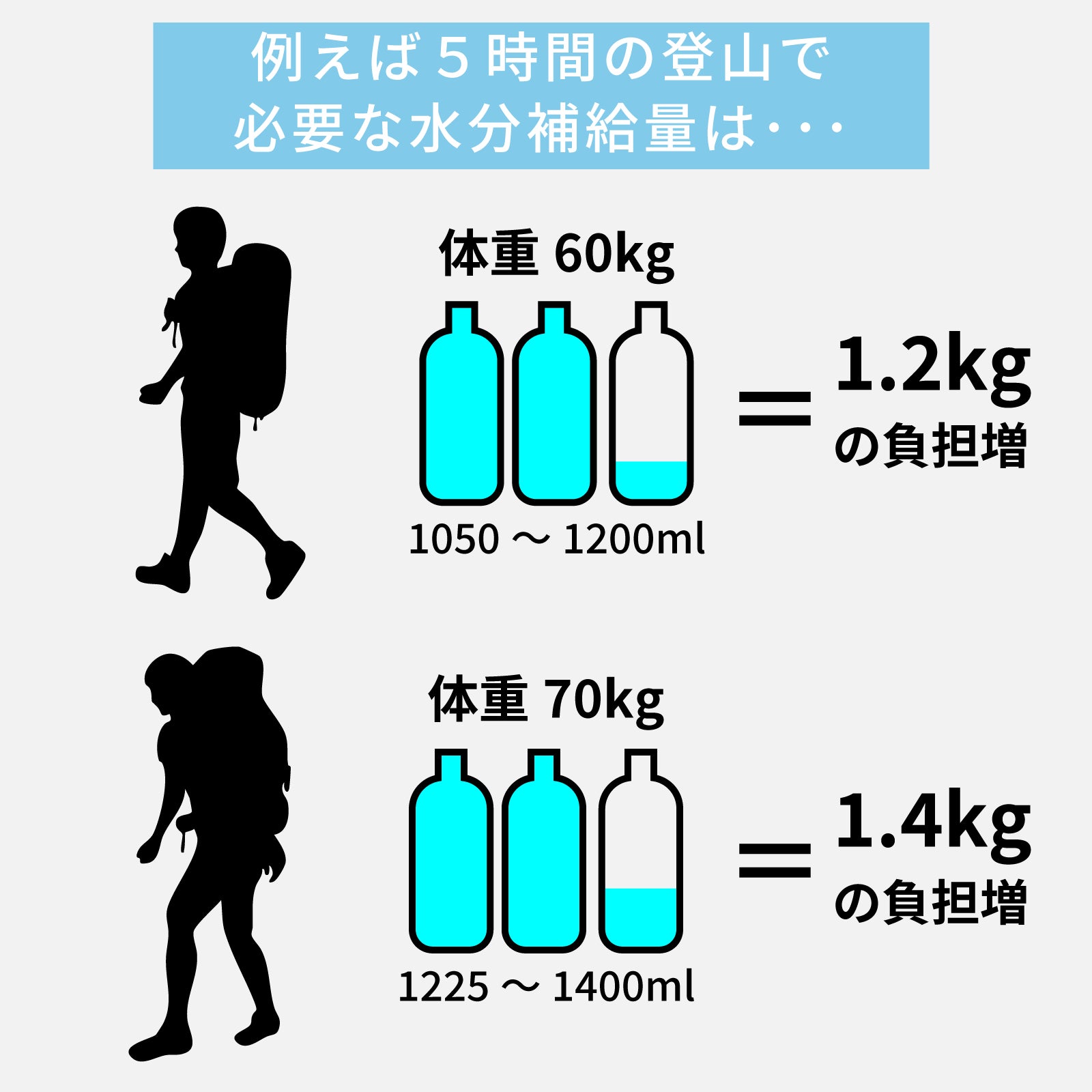 人は1日に最低でも2.5ℓの水が必要で、これだけでも2.5kgの荷物を持ち歩くことに・・・。