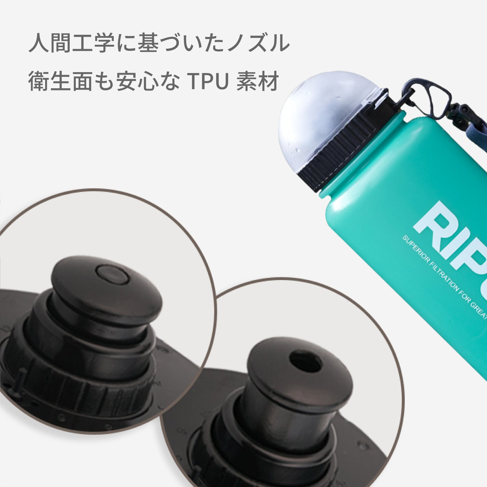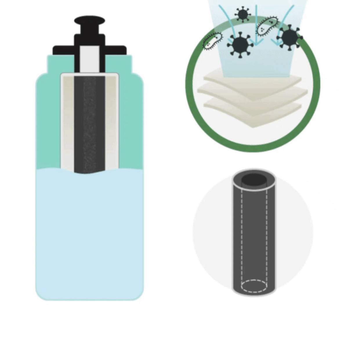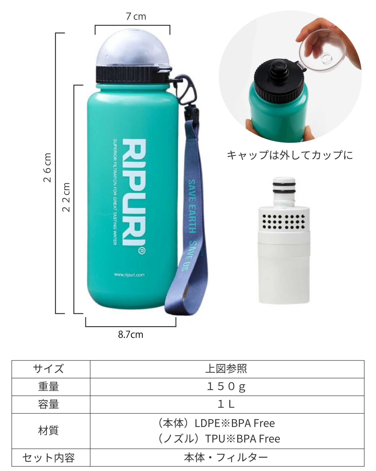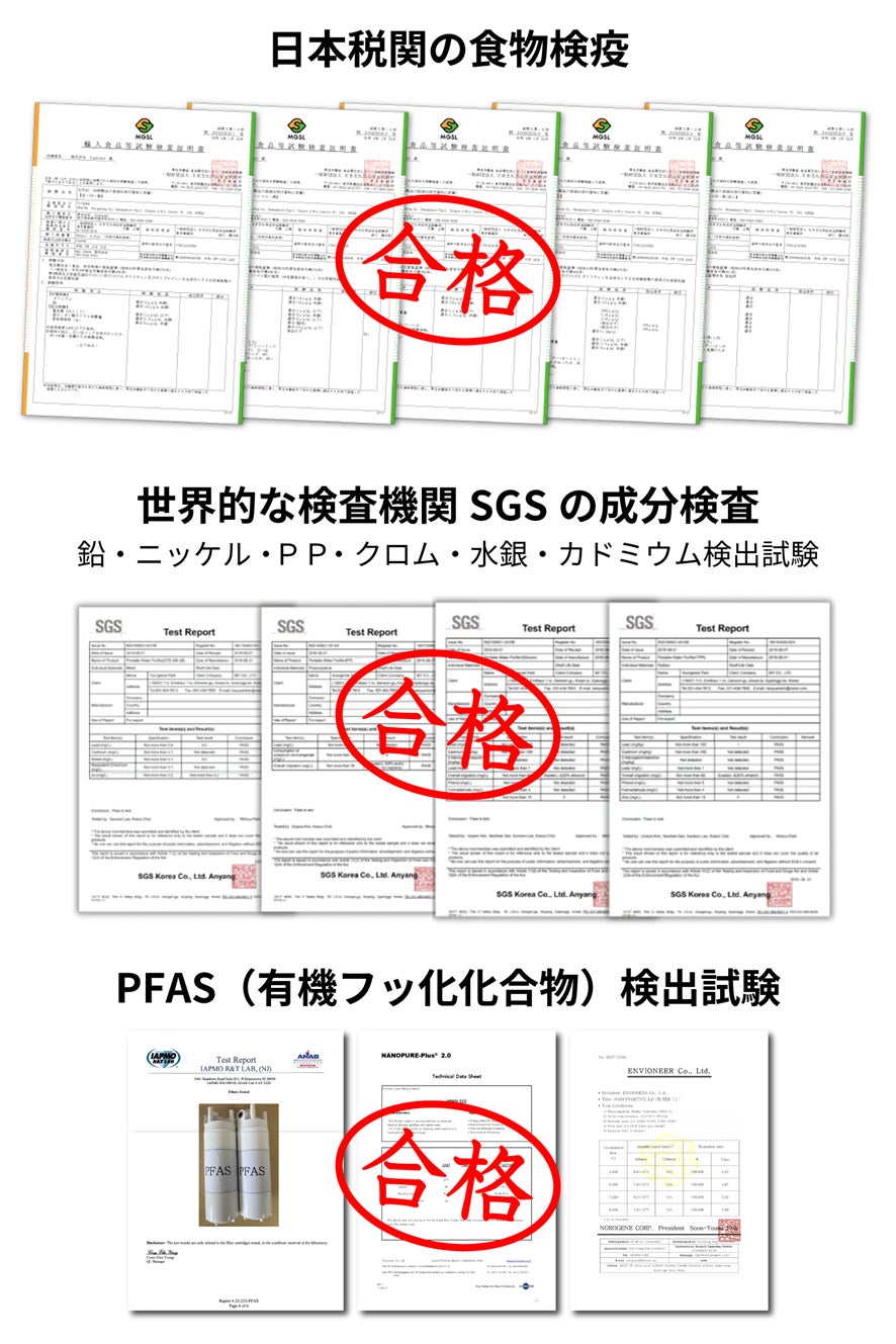 ボトル素材は 抗菌・無味保持・エコ の三拍子。フィルターは 水道水用 と 汚水対応の高性能型 を実現し、各国で認証。