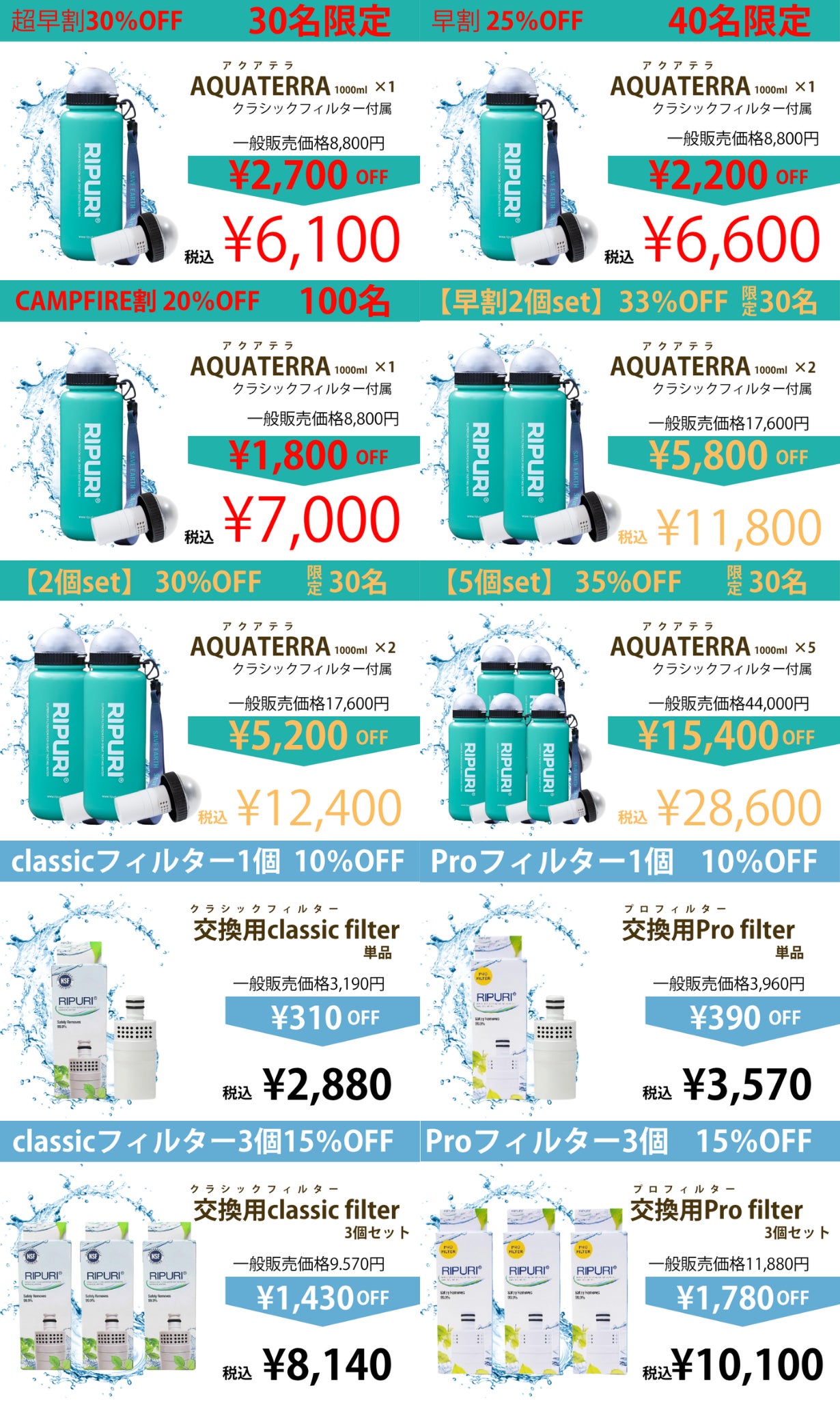 2025/07/07 20:12本日ついに、AQUATERRAのクラウドファンディングがスタートしました!AQUATERRAは「いつでもどこでも安心して水が飲める社会をつくりたい」という想いから生まれた、超軽量の高性能ポータブル浄水ボトルです。・ウイルス・バクテリアまで除去・NSF認証の高性能フィルター・ポンプも電池も不要で1秒浄水・登山・災害・海外旅行にも対応・最大30%OFFスタートから勢いを感じています!今後も開発の裏話や活用シーンなどを活動報告で共有していきますので、ぜひご期待ください。引き続き、どうぞ応援よろしくお願いします!プロジェクトページはこちら:https://camp-fire.jp/projects/850960/view もっと見る