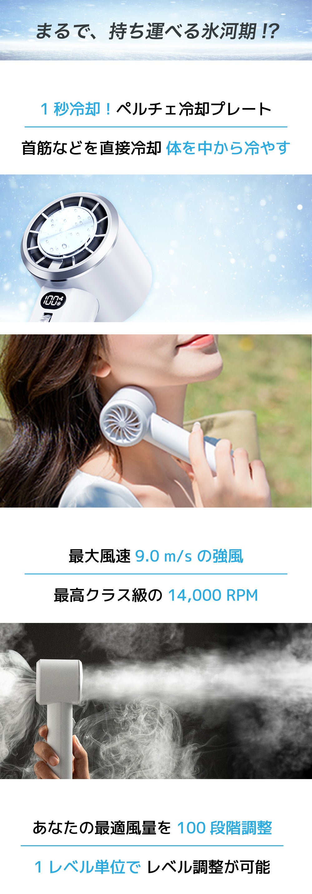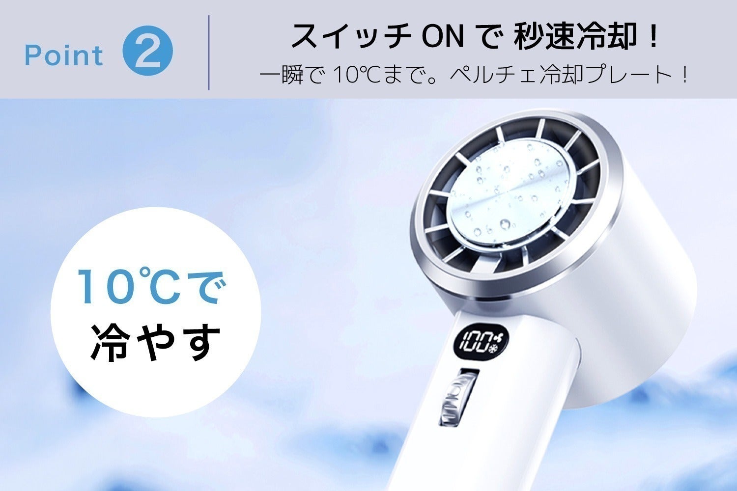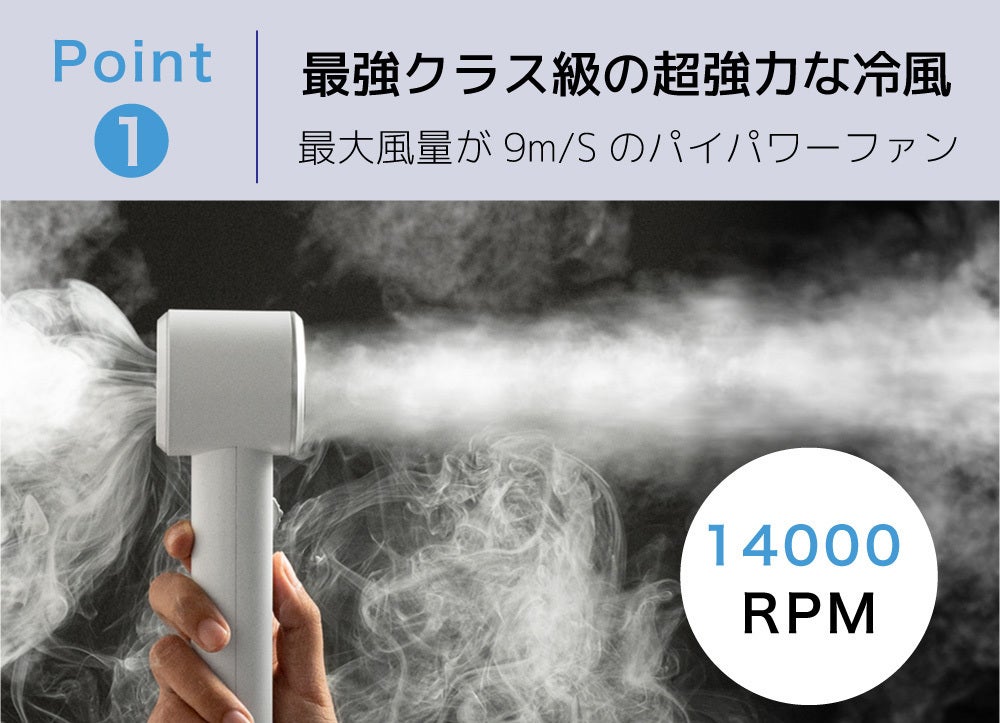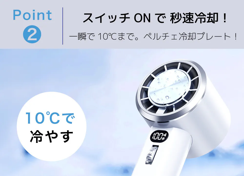わずか1秒で、10℃の冷たさを作り出し、風速9m/sの超強力な風を作り出す、コンパクトハンディファン!