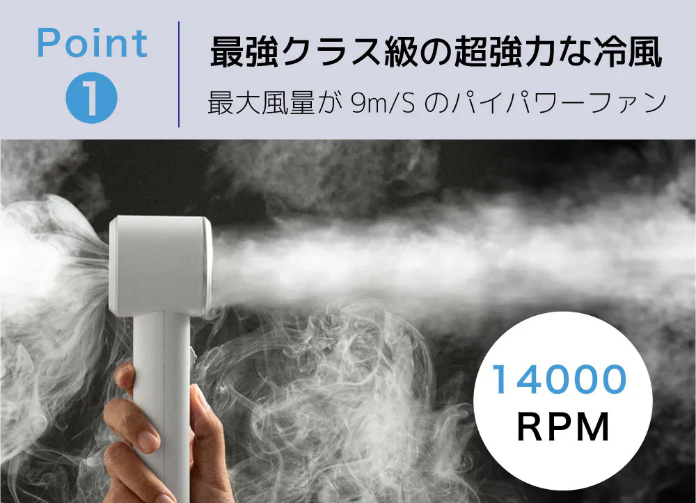 FROIDCOOLは、ハンディファンではトップレベルの風速9.0m/S(14000RPM)の強力な風量を持ったハンディファンです。