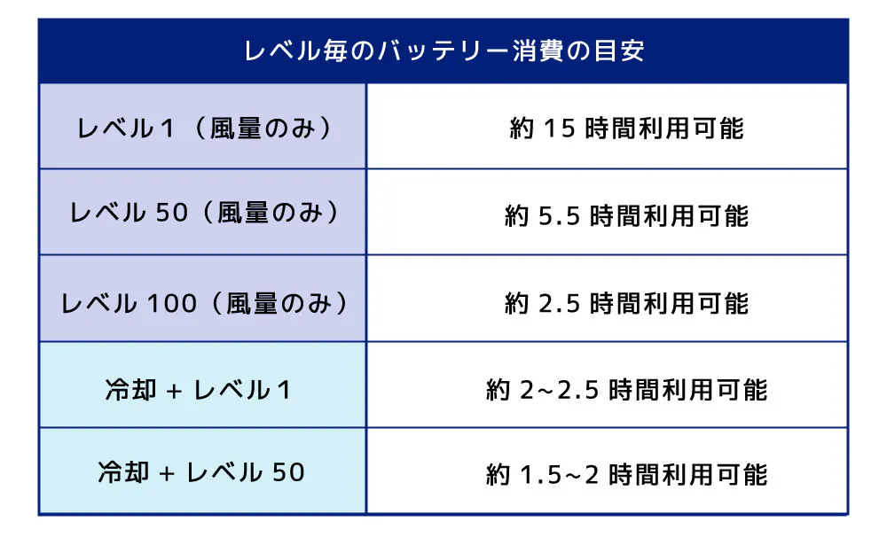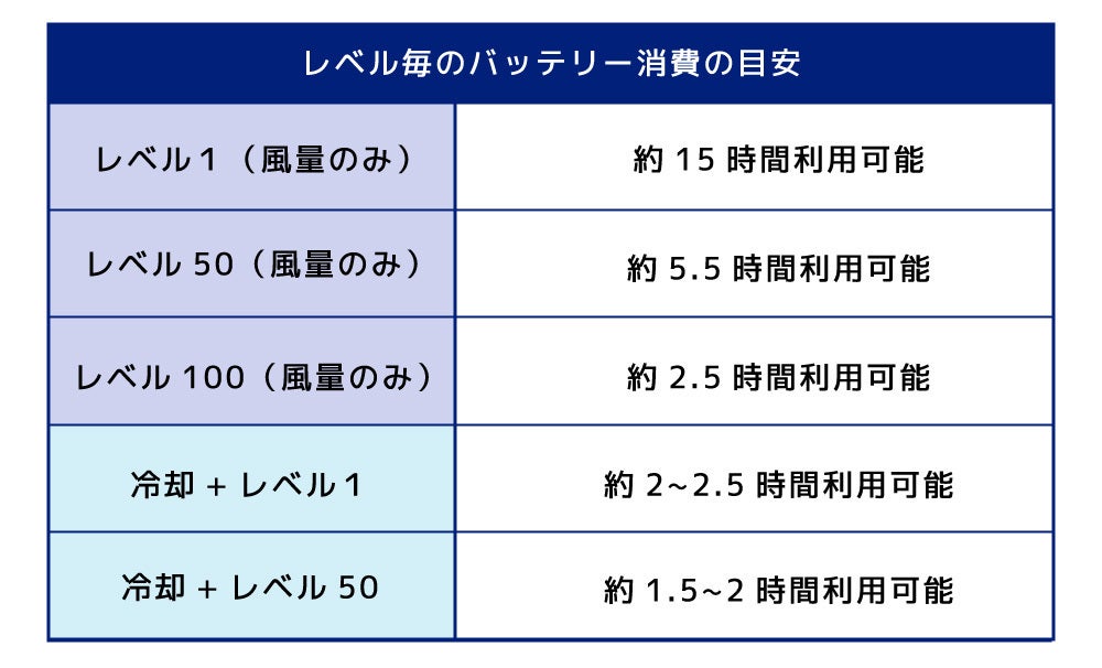 連続して1時間以上ファンを利用することは滅多に発生しないことを考えれば1回の充電でお出かけ分を十分にカバーすることができます。(最大風量を長時間連続で使えば、消耗は激しくなります。*以下の利用時間の目安を参照)