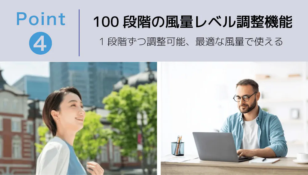 FROIDCOOLは、最大100段階の調整を1レベル単位でコントロールすることが可能な100段階調整機能を搭載。個人によって異なる温度管理に繊細に対応することができるハンディファンです。