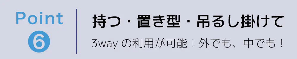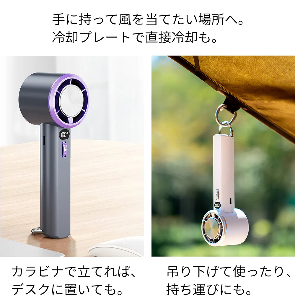 外出時に手で持って涼しさを感じることも、デスクの上での置き型の扇風機としても、アウトドアで吊るして皆で楽しめる冷感スポット作りにも!