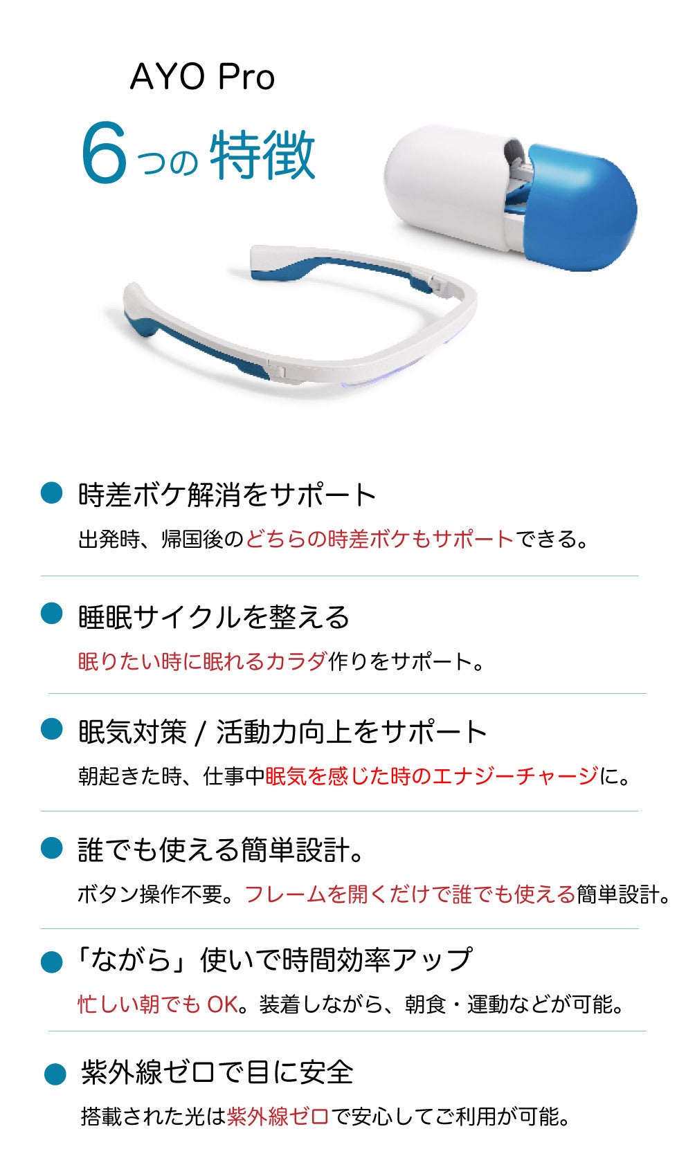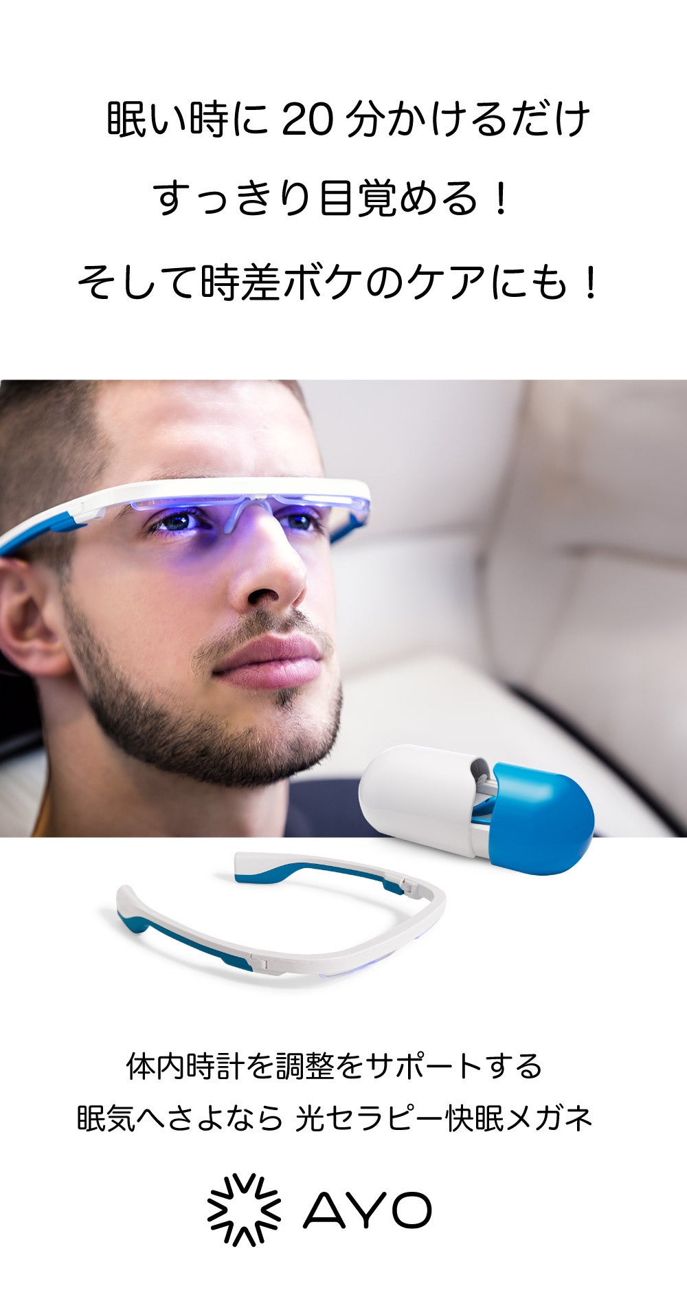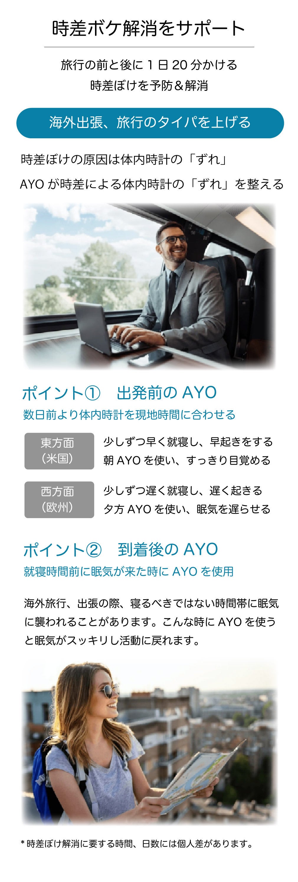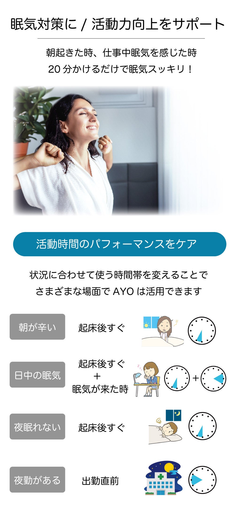 AYO PRO があれば「眠い時に20分かけるだけ ➤ すっきり目覚める ➤ 時差ボケの解消をサポート」が