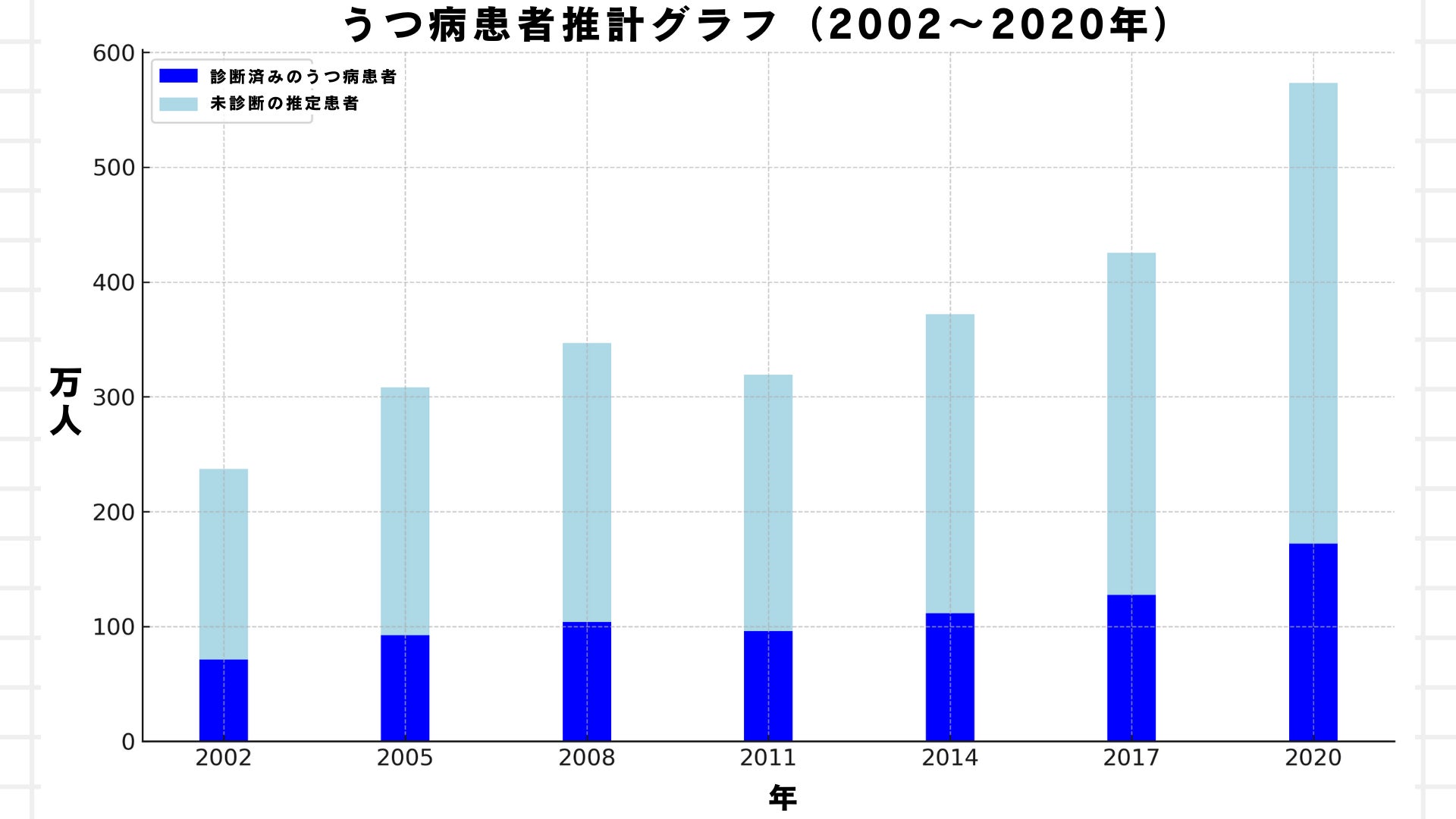 日本ではうつ病を含む気分障害の患者数が、2020年時点で172万人を超え、年々増加傾向にあります(厚生労働省・患者調査より)。